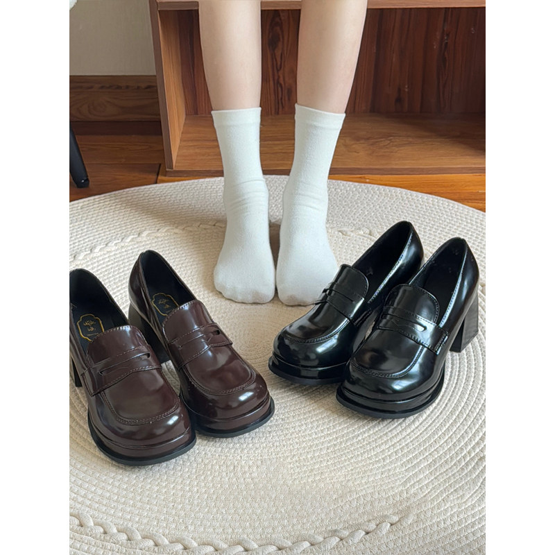 羊皮~棕色山茶花乐福鞋女2025新款通勤粗跟单鞋百搭英伦风小皮鞋