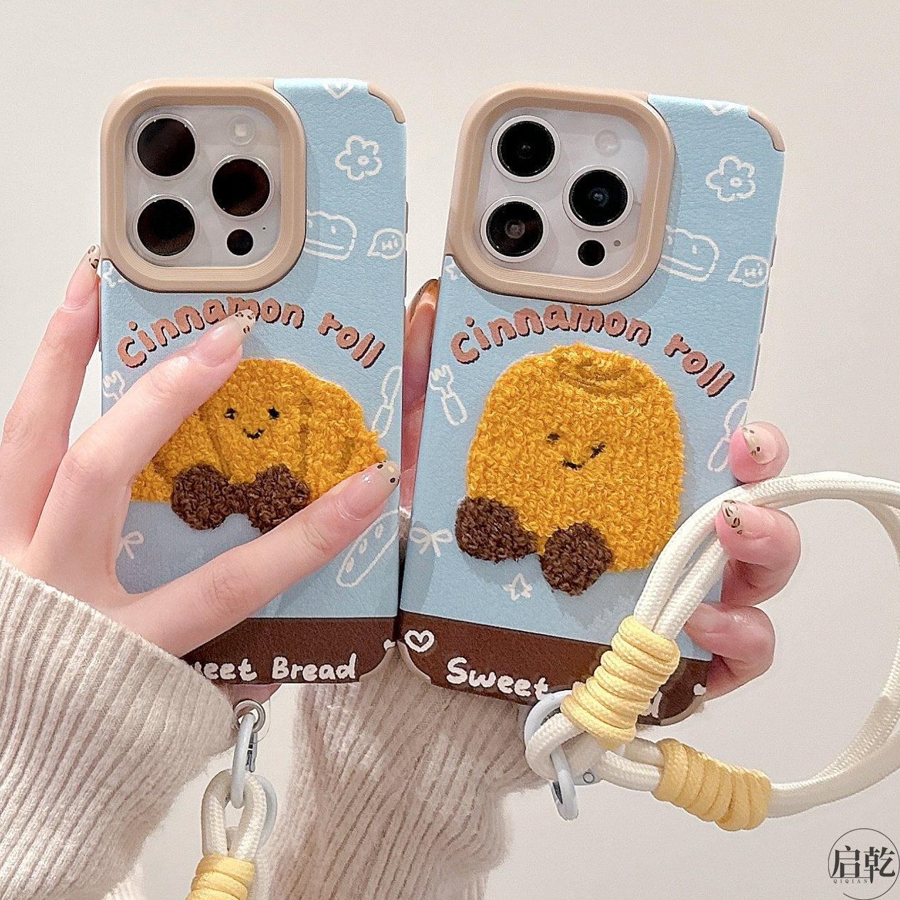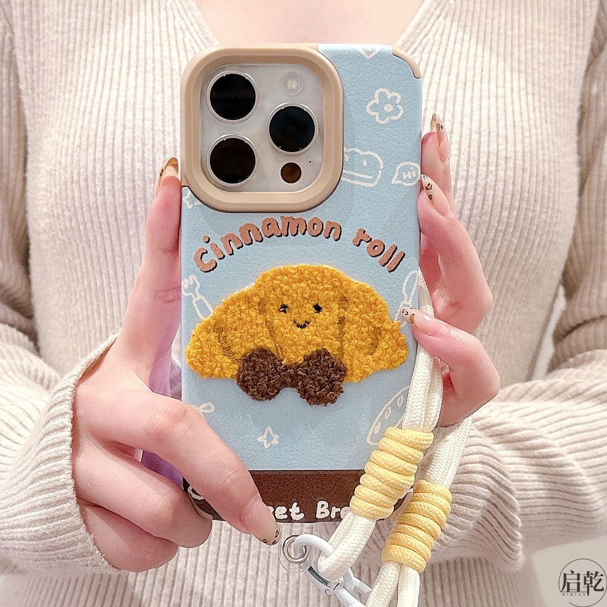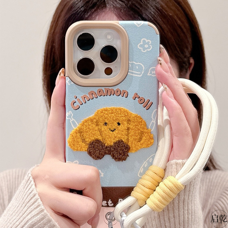 启乾 刺绣牛角包土豆表情腕带iPhone16/15手机壳适用苹果14/13promax皮质软壳12/11链条挂绳可爱卡通新款情侣