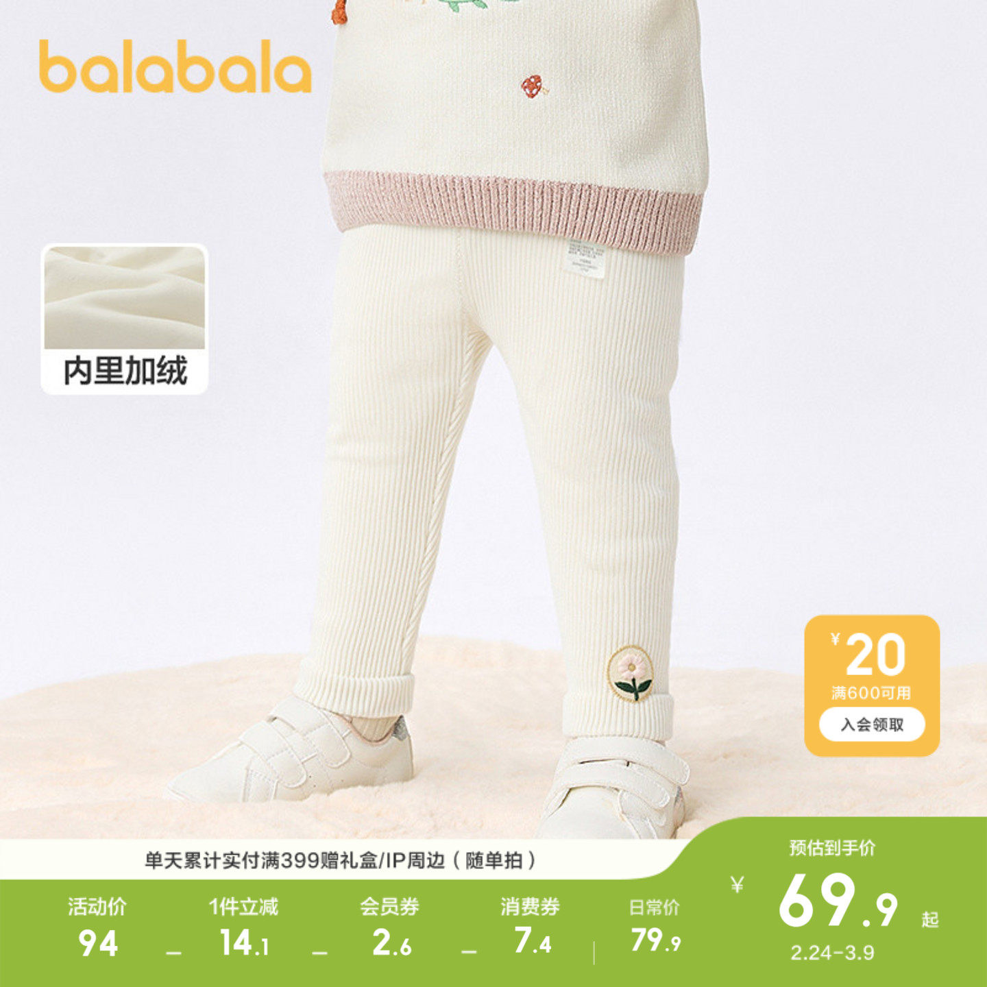 巴拉巴拉童装婴儿长裤加绒打底裤女童宝宝裤子2026秋冬装休闲保暖