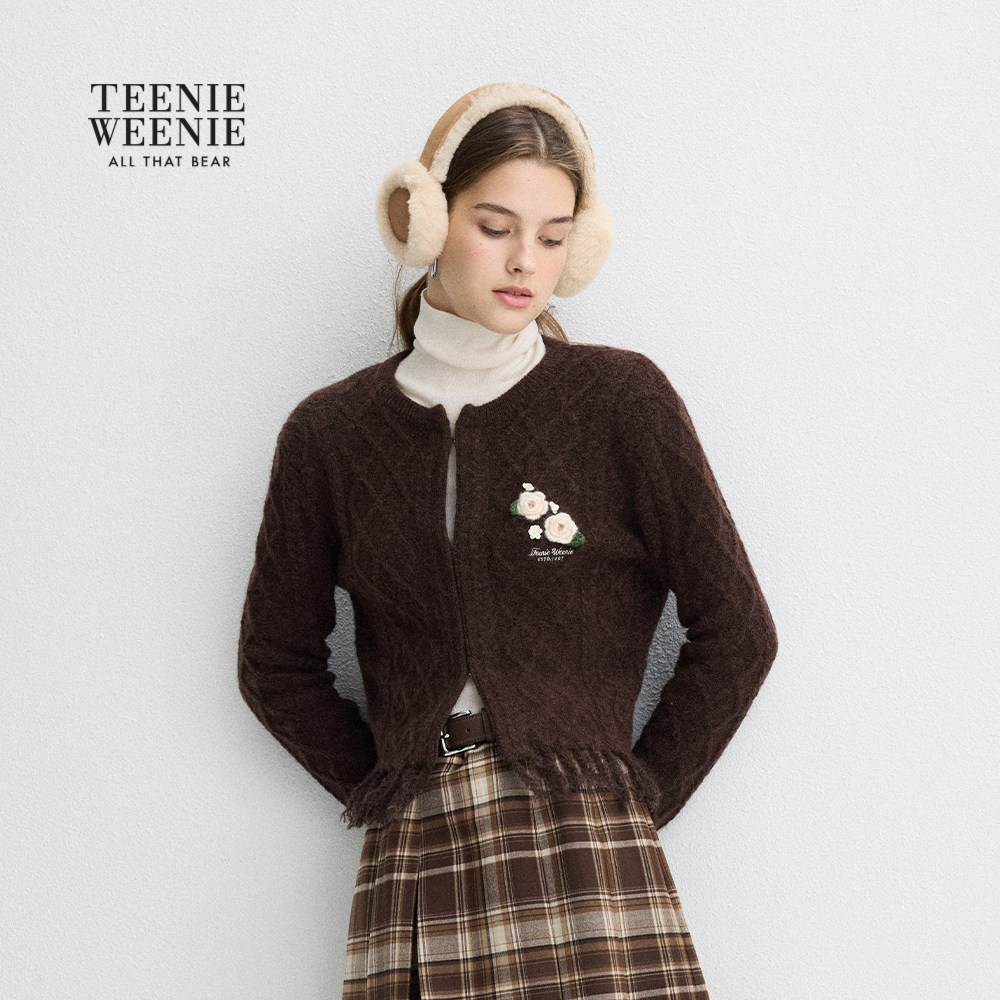 TeenieWeenie小熊女装毛针织衫秋冬季菱形格纹绞花流苏毛衣外套