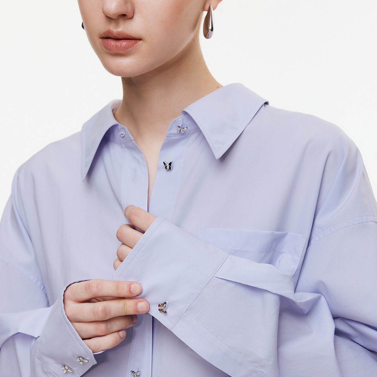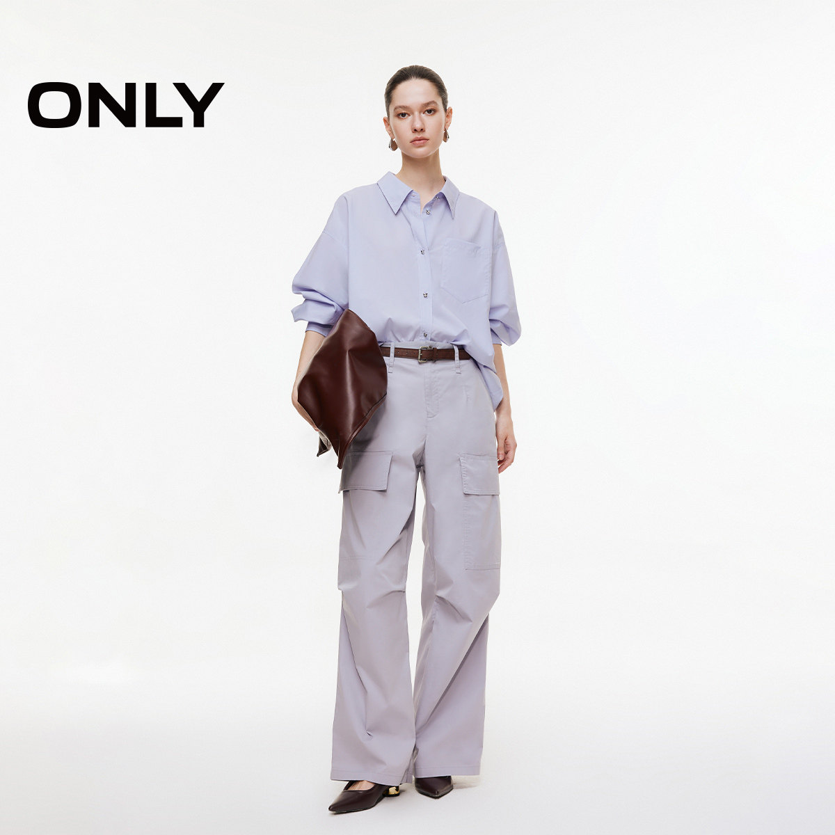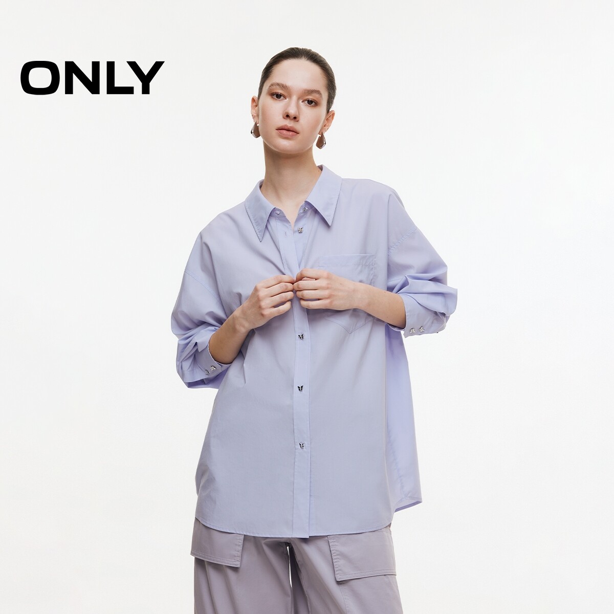 ONLY2026春季新款露背立体蝴蝶结质感蝴蝶钻扣纯色宽松长袖衬衫女