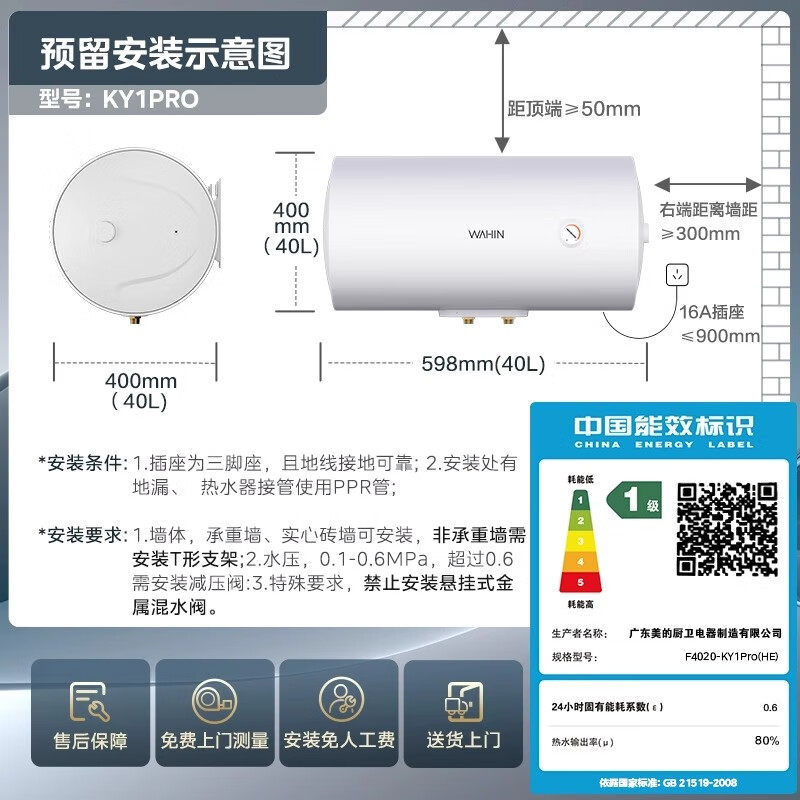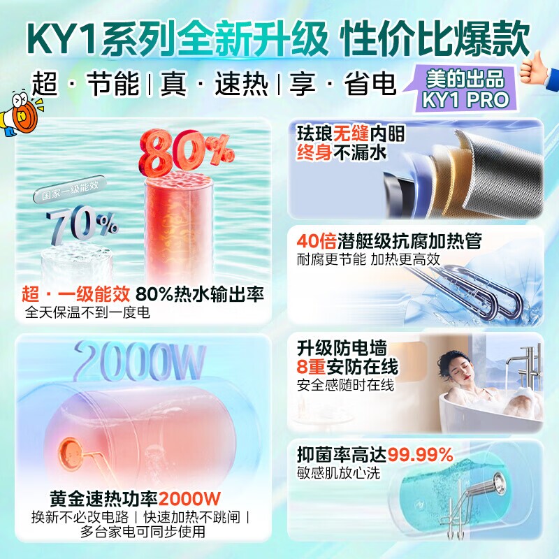 美的电热水器家用卫生间洗澡带防电墙一级能效60L节能租房速热50L