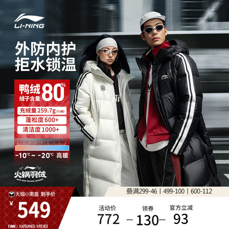李宁火锅羽绒服丨男冬季鸭绒长款加厚上衣情侣防寒保暖衣服外套女