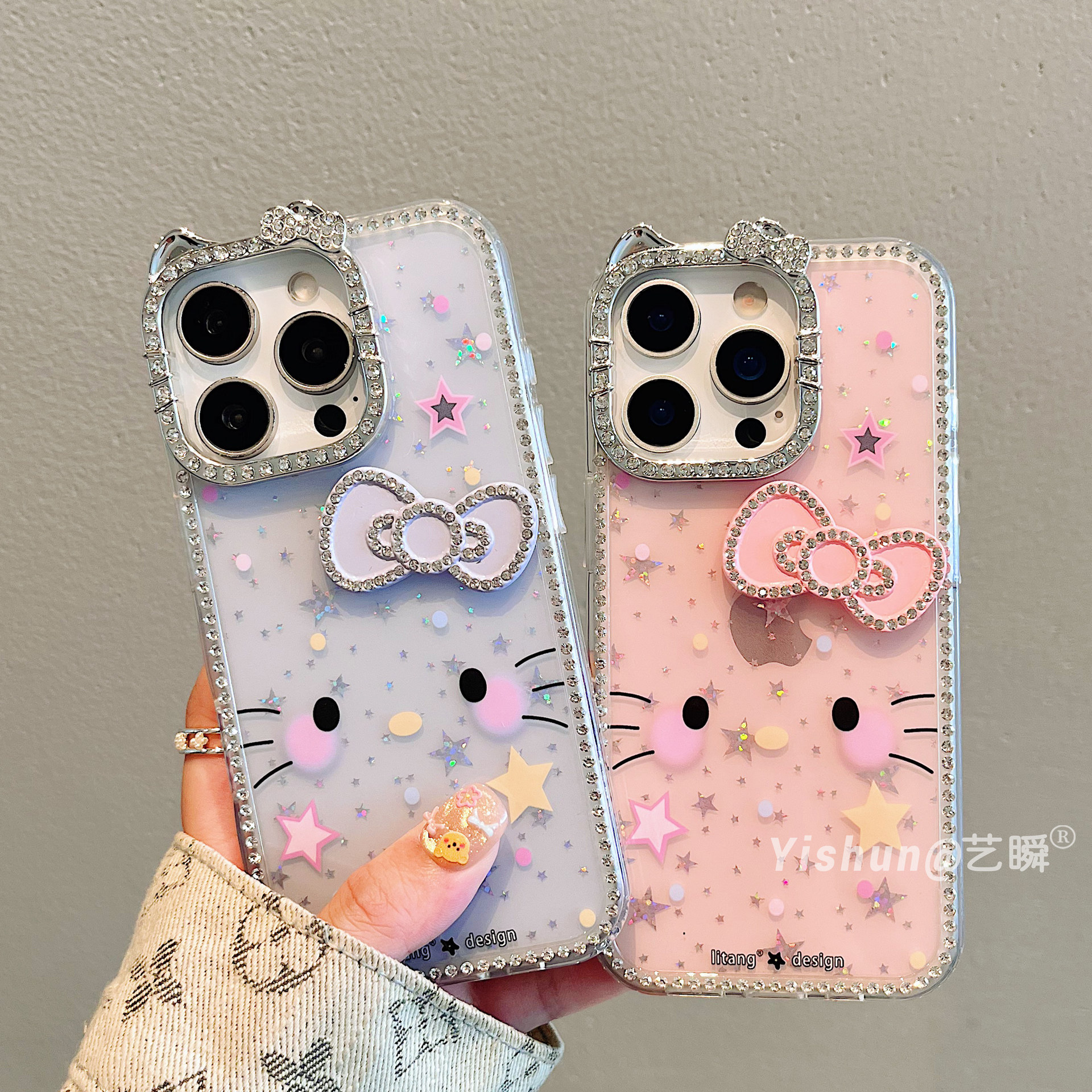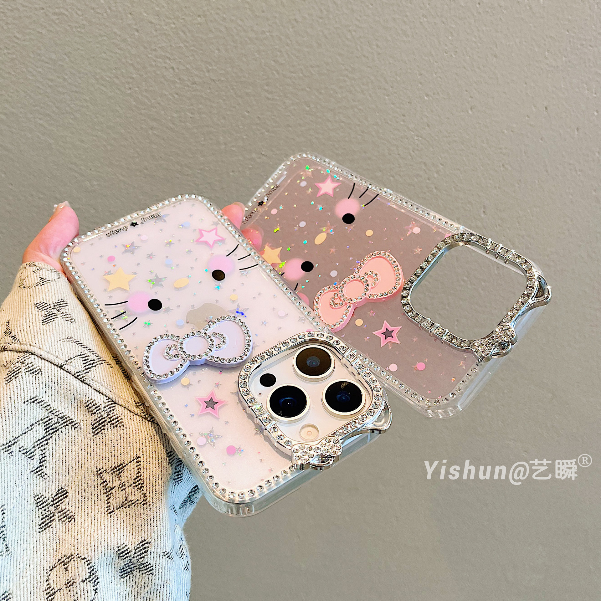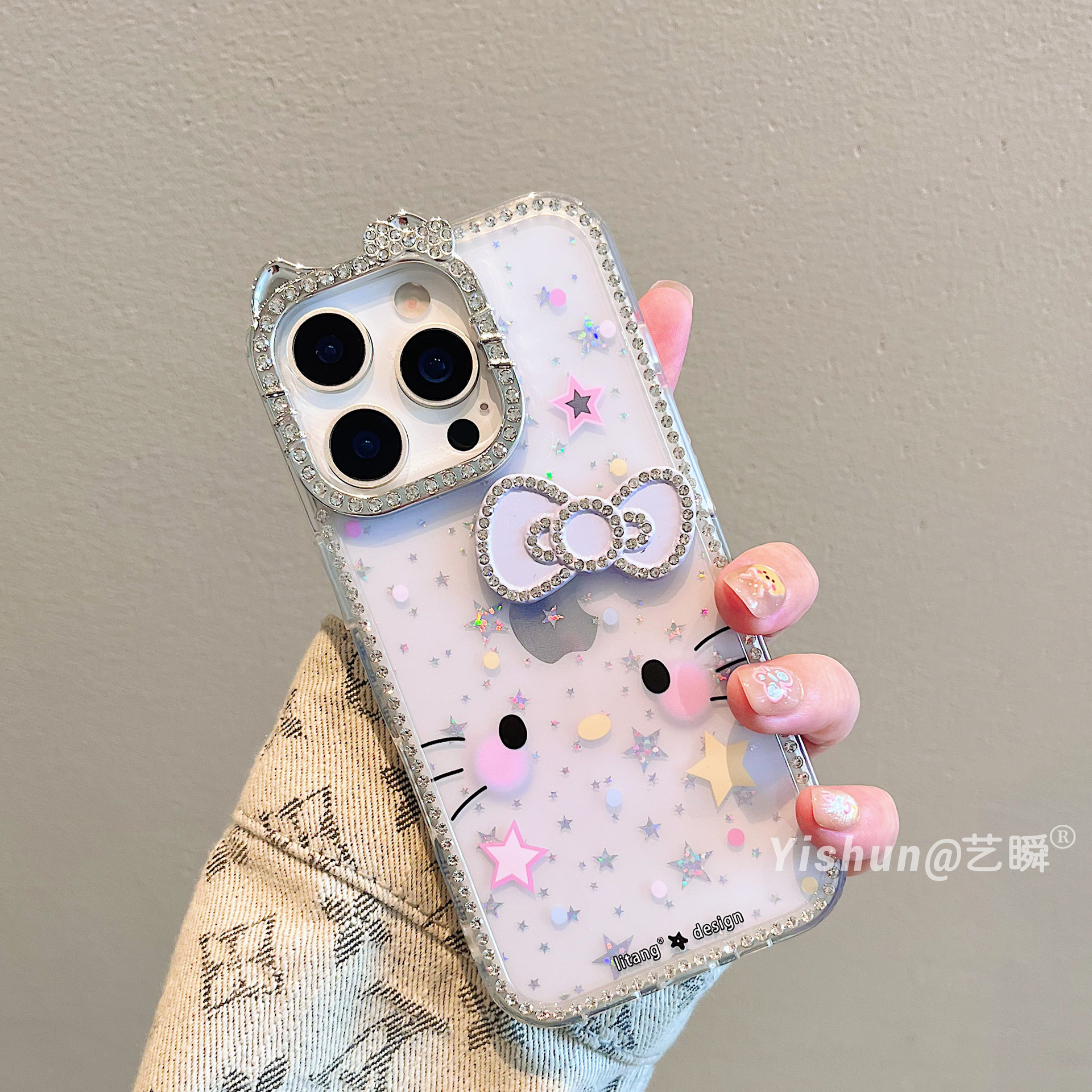 彩色波点星星腮红kt猫适用16ProMax苹果手机壳iPhone17pro透明亮片15pm满钻镜框13少女心plus小众14Pro保护套