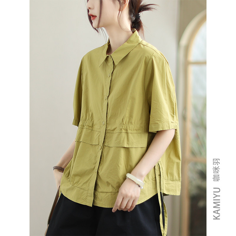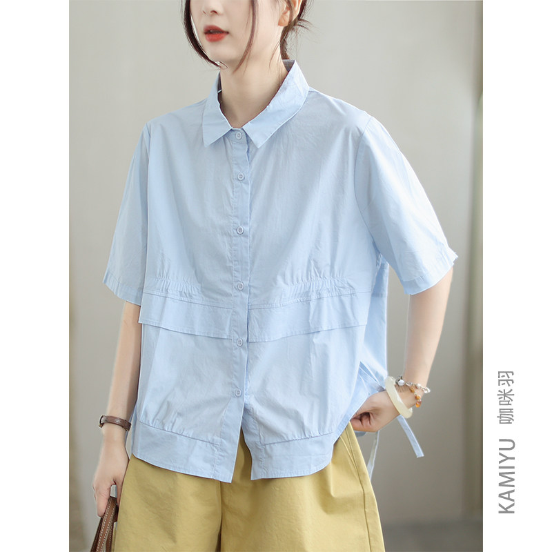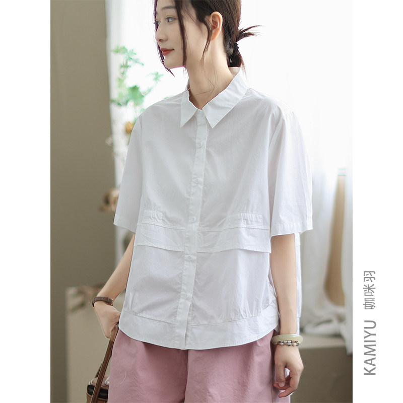 咖咪羽100%棉夏季女士衬衫短袖女宽松百搭复古时尚气质女装T恤女