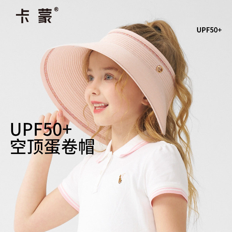 卡蒙儿童新款防晒空顶草帽女可扎马尾防紫外线可折叠太阳帽5-12岁