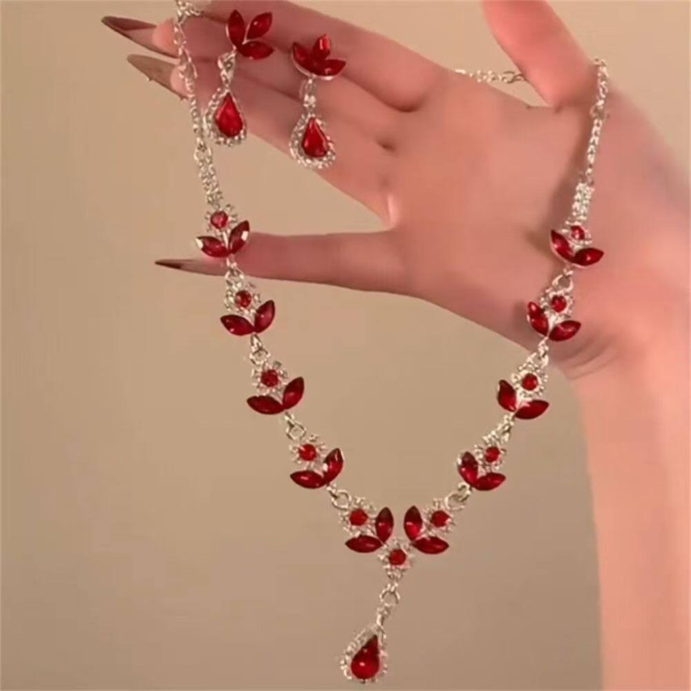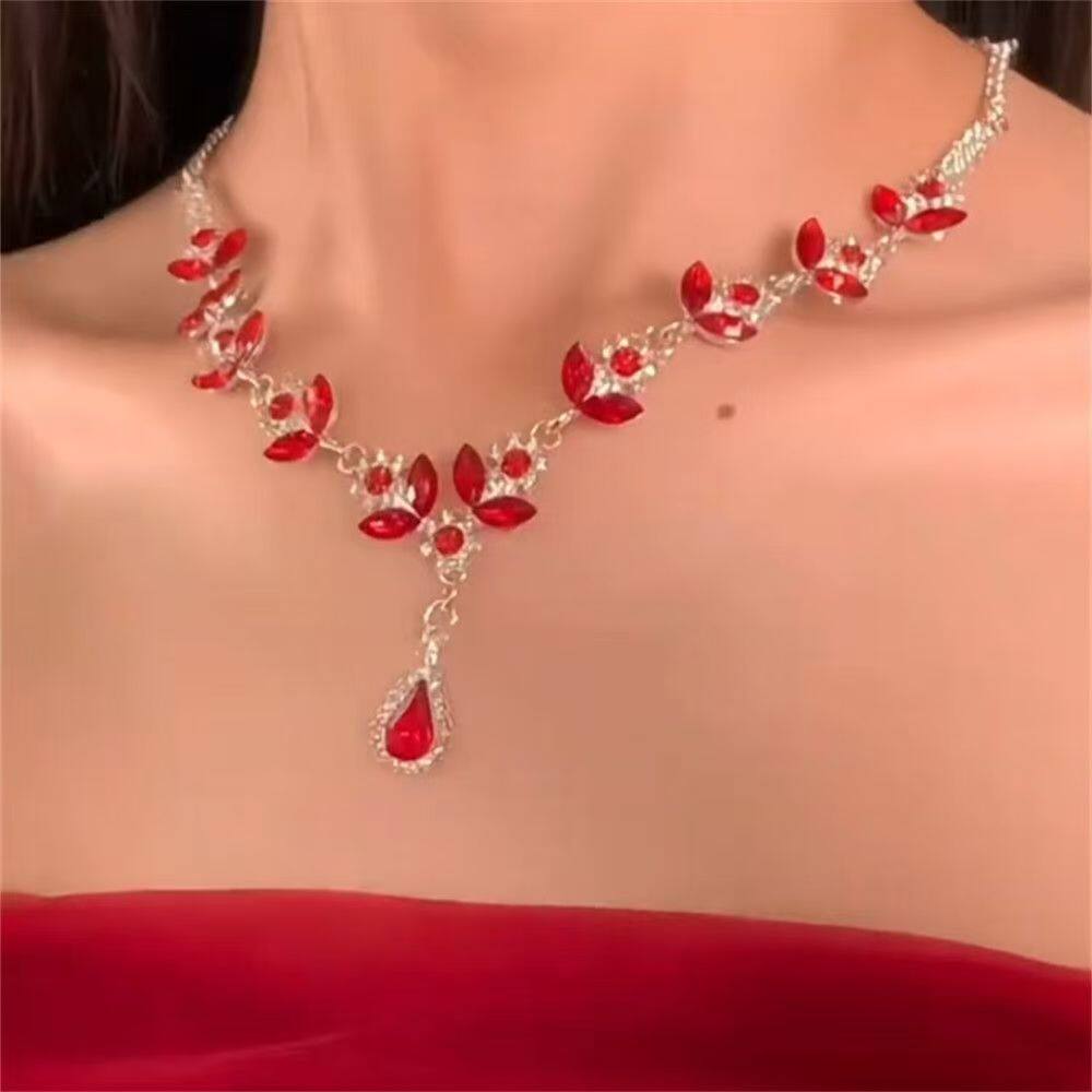 宫廷风红锆石水滴流苏项链耳环新娘晚礼服锁骨链耳钉轻奢高级配饰