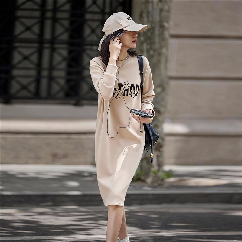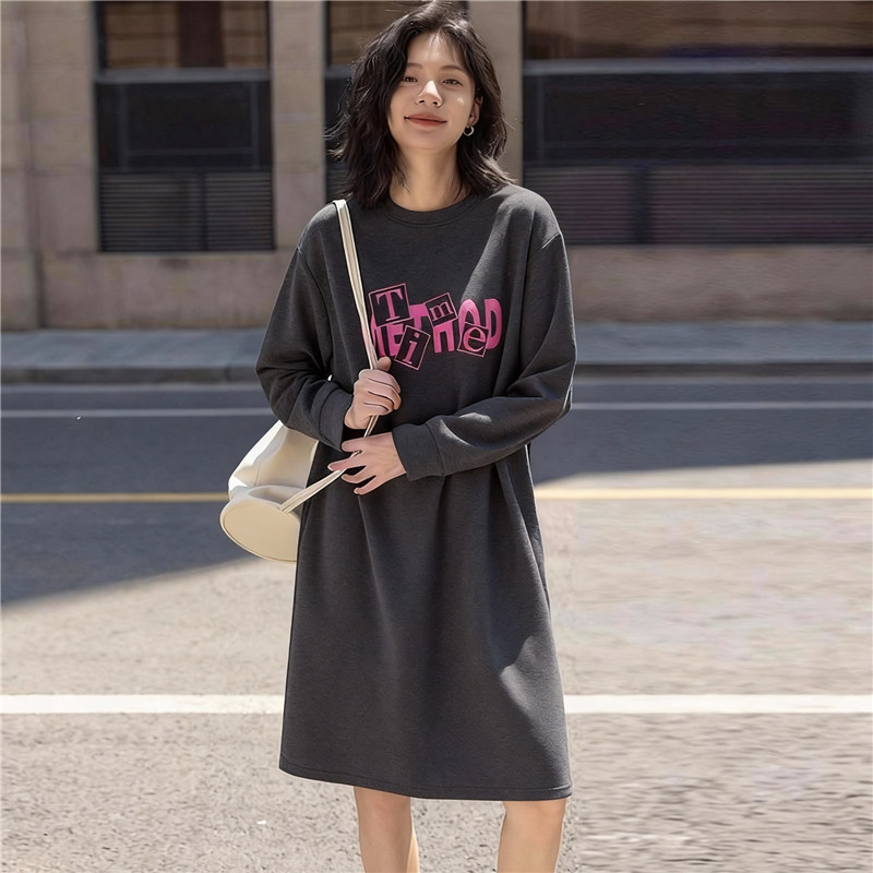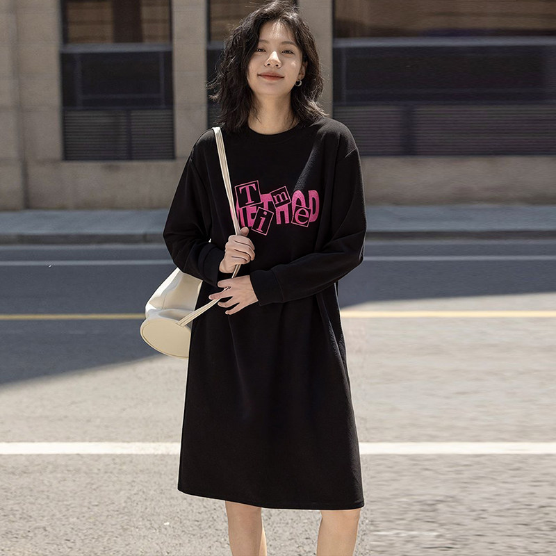 孕妇装中长款宽松显瘦长袖纯棉连衣裙春秋季韩版百搭字母印花裙子