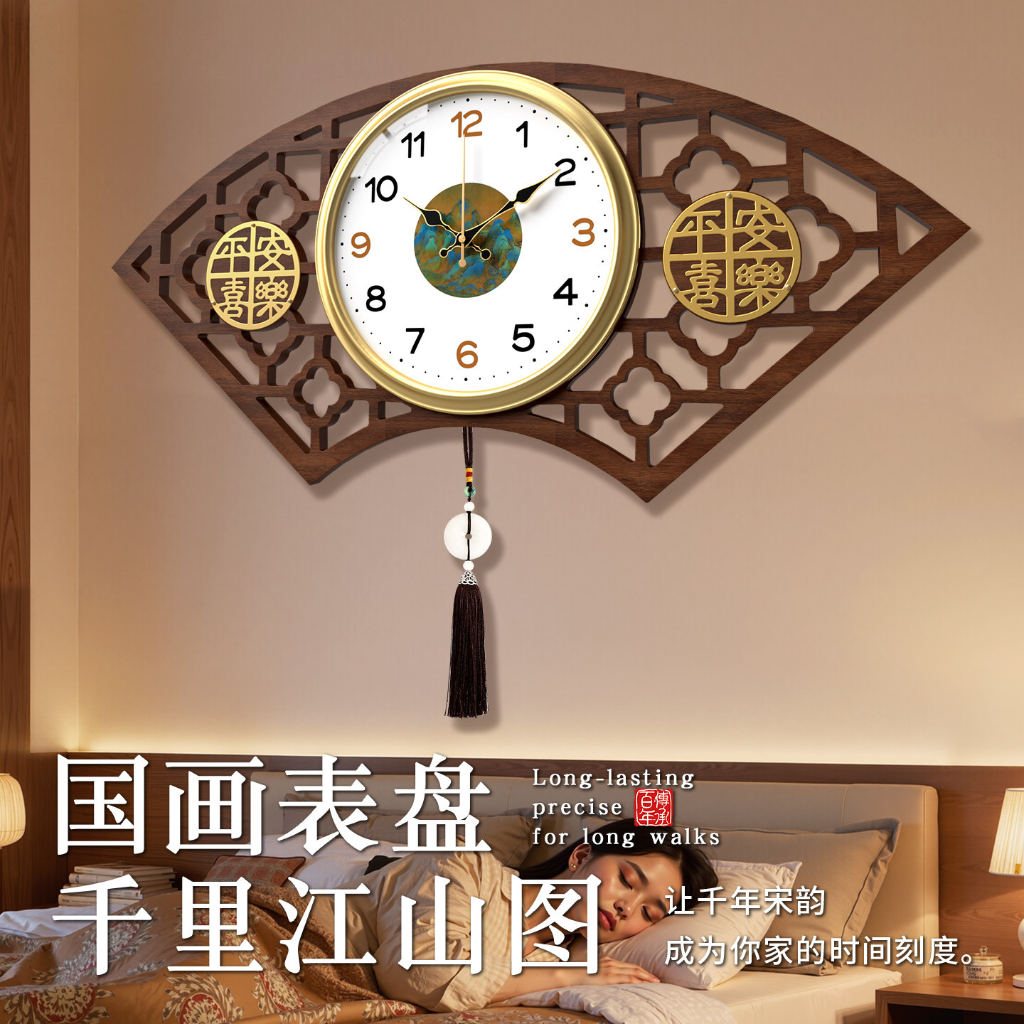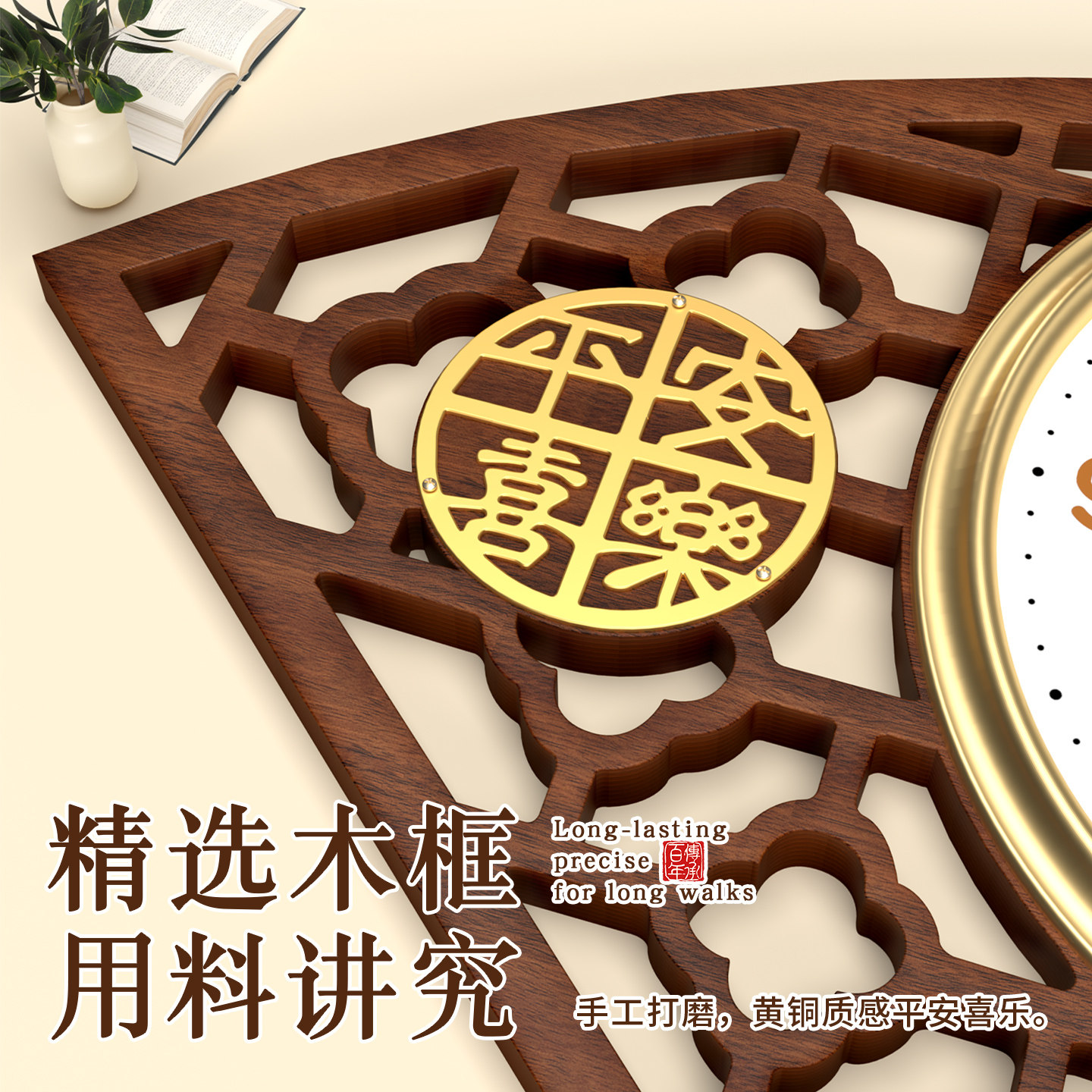 康巴丝新中式挂钟扇形木质静音时钟表客厅装饰高档挂墙轻奢石英钟