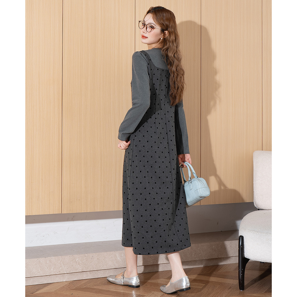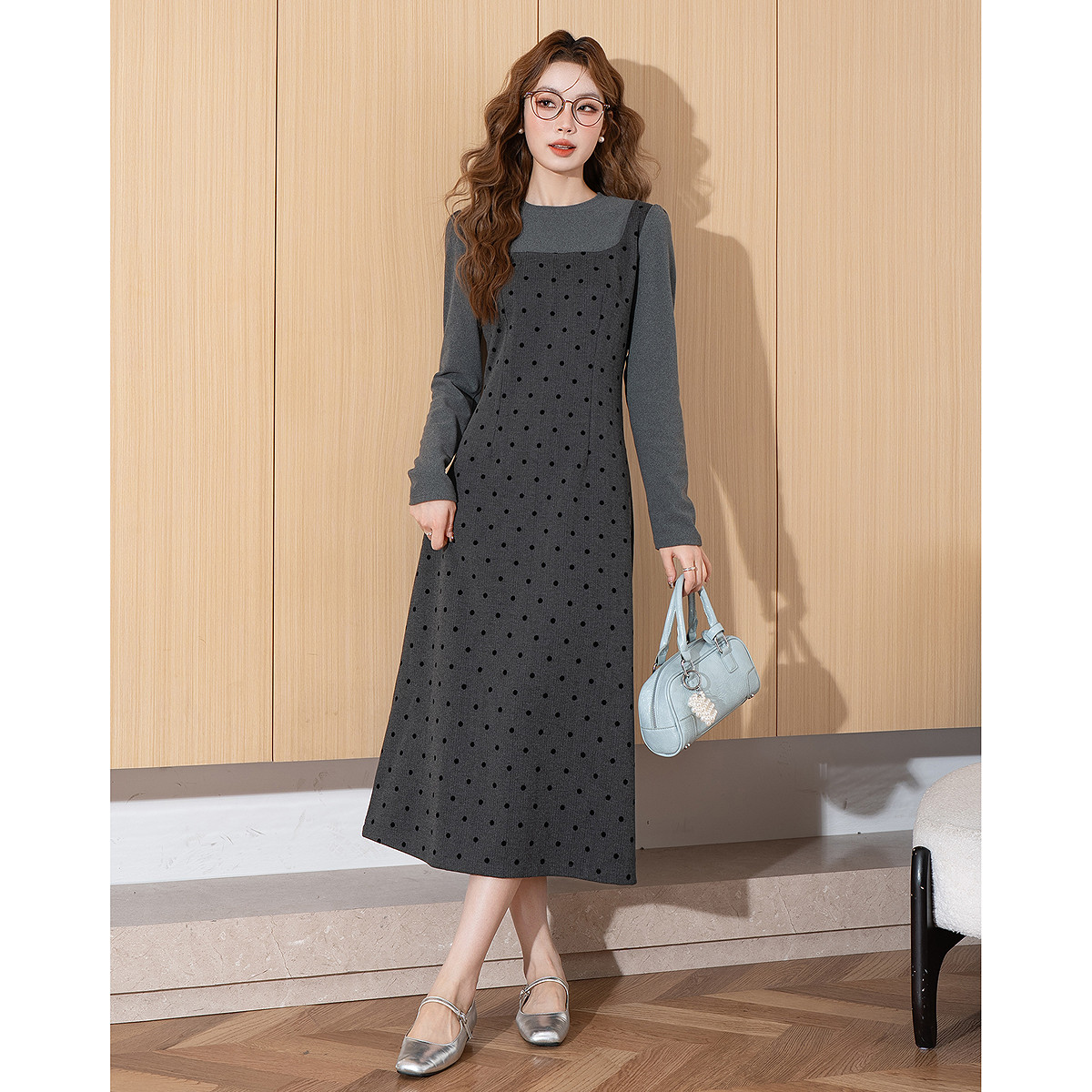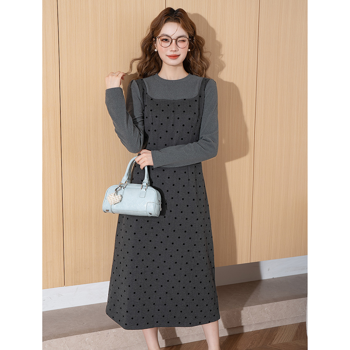 唐狮秋冬季女连衣裙假两件长裙灰色气质温柔风波点小个子穿搭tu