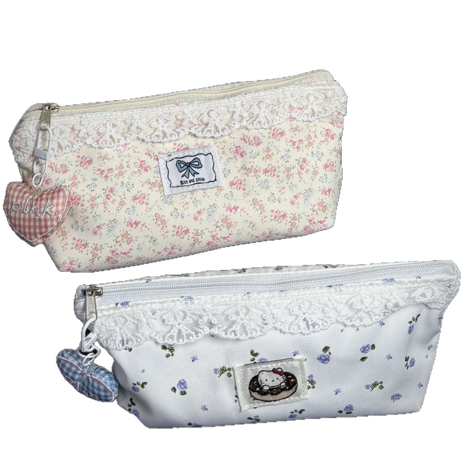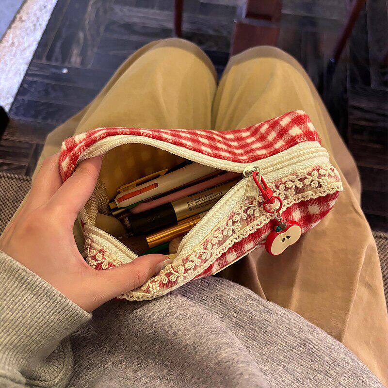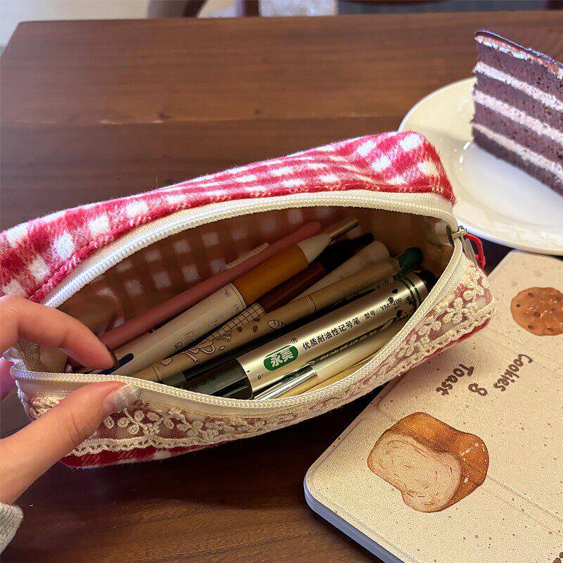 红格子蕾丝笔袋可爱高颜值复古大容量文具盒初高中生文具收纳包袋