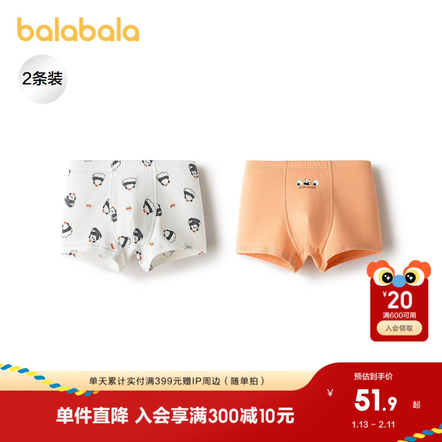 【商场同款】巴拉巴拉男童内裤儿童四角短裤大童亲肤不夹PP两条装