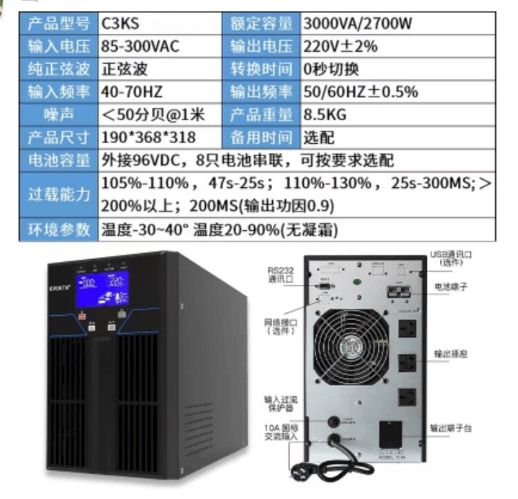 UPS不间断电源C3K在线式3KVA/2700W外接电池服务器电脑机房