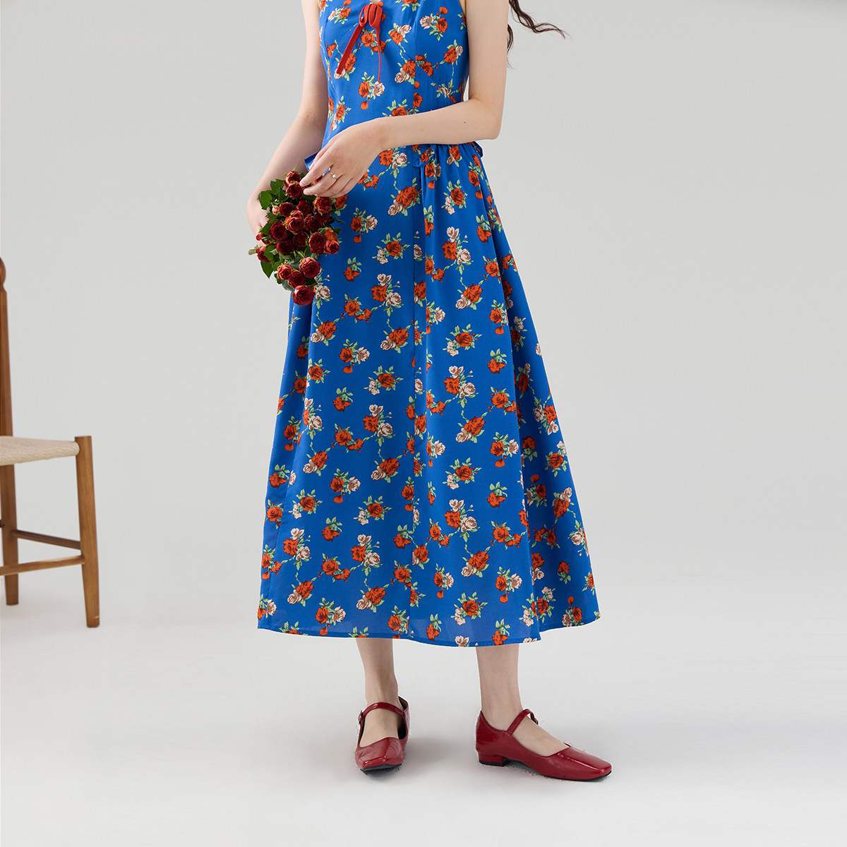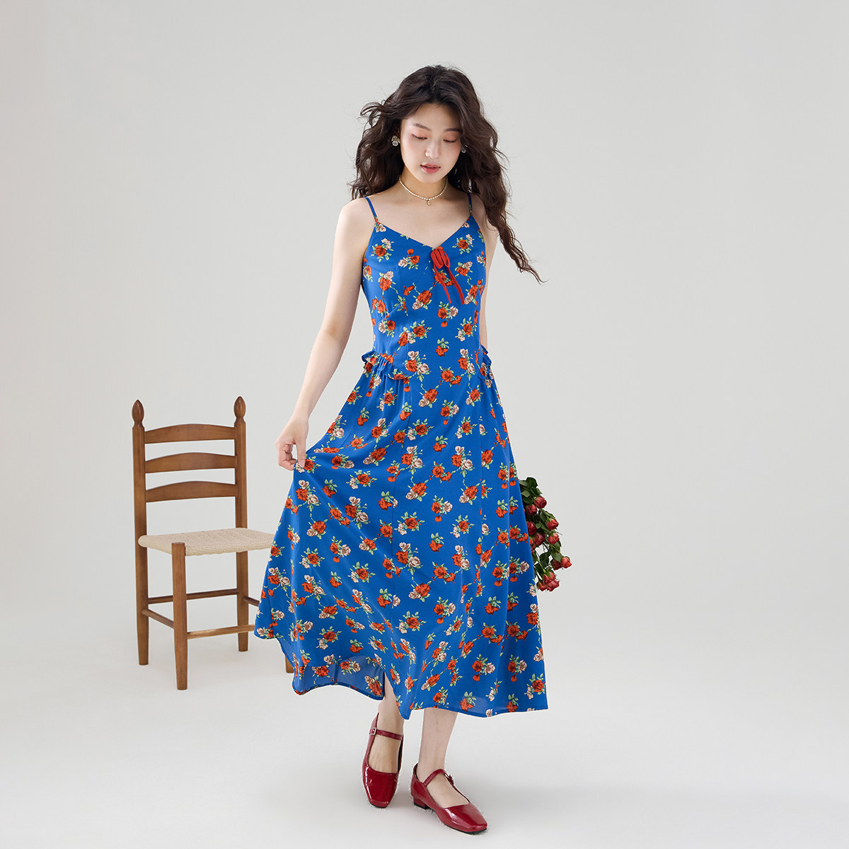 雨菲2025夏新款碎花v领飞飞边清冷大美人设计感显瘦斜裁连衣裙女