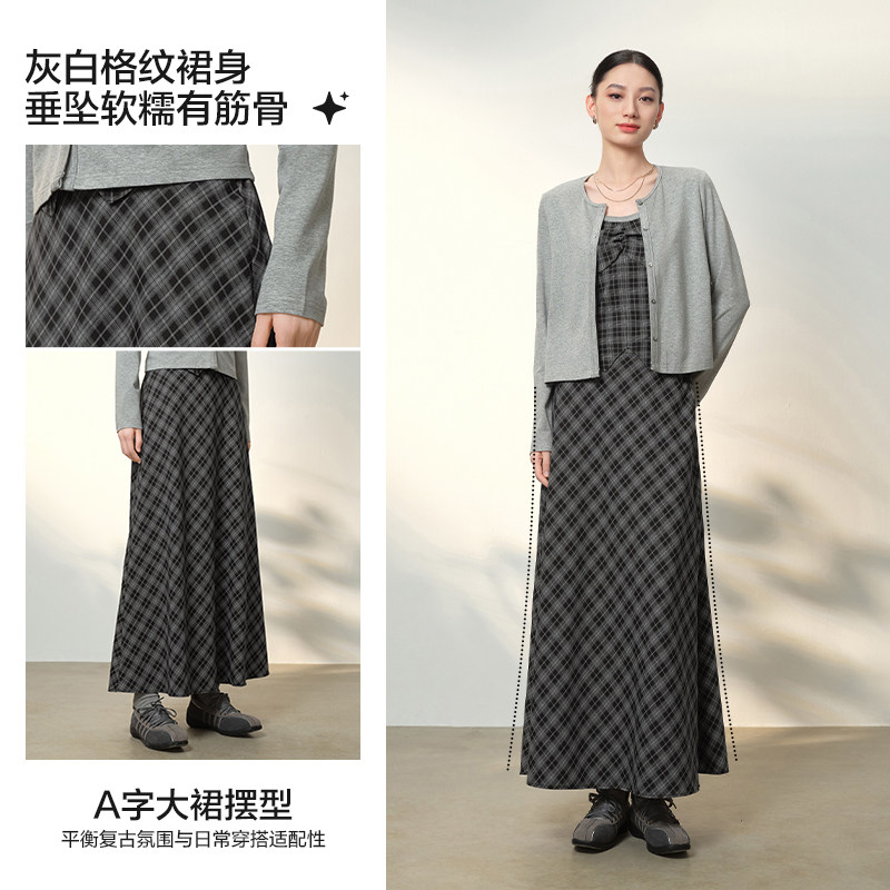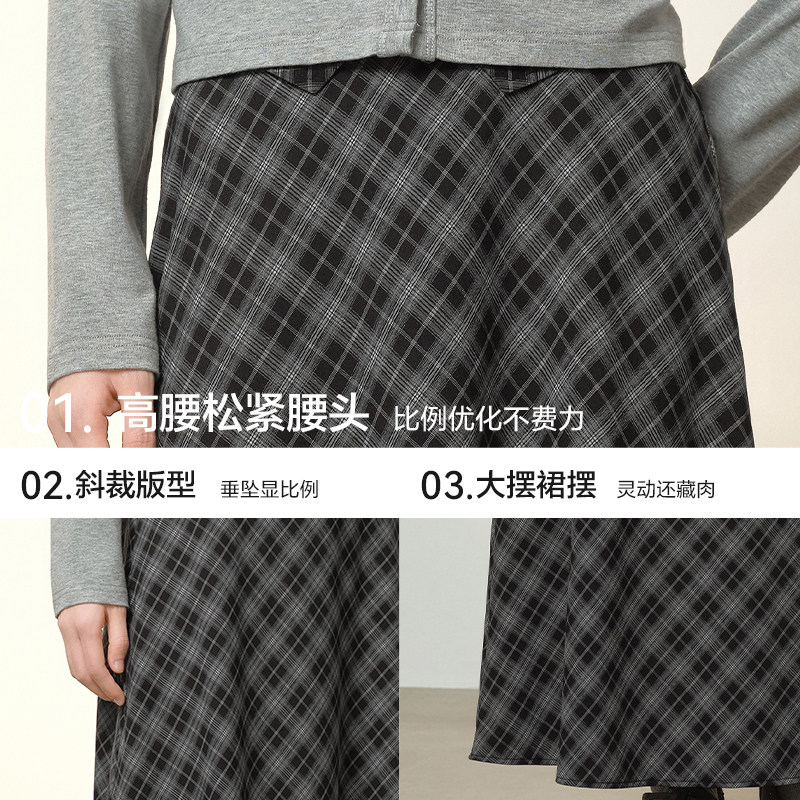 爱居兔复古学院风格纹半身裙女2026年春季新款高腰通勤A字长裙