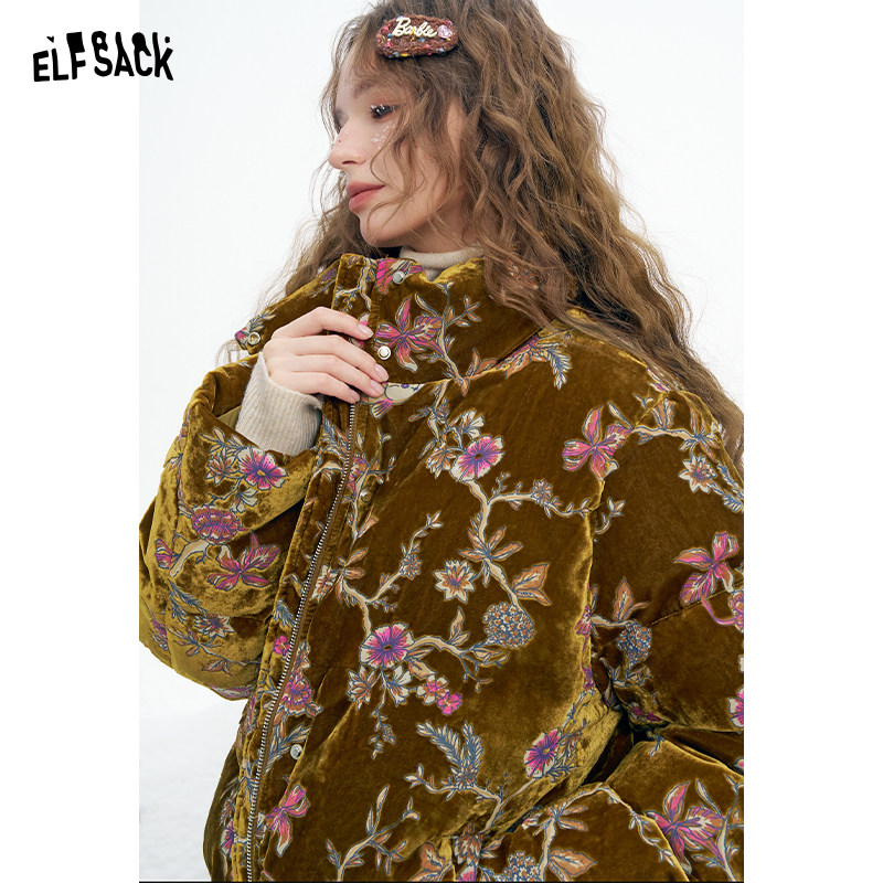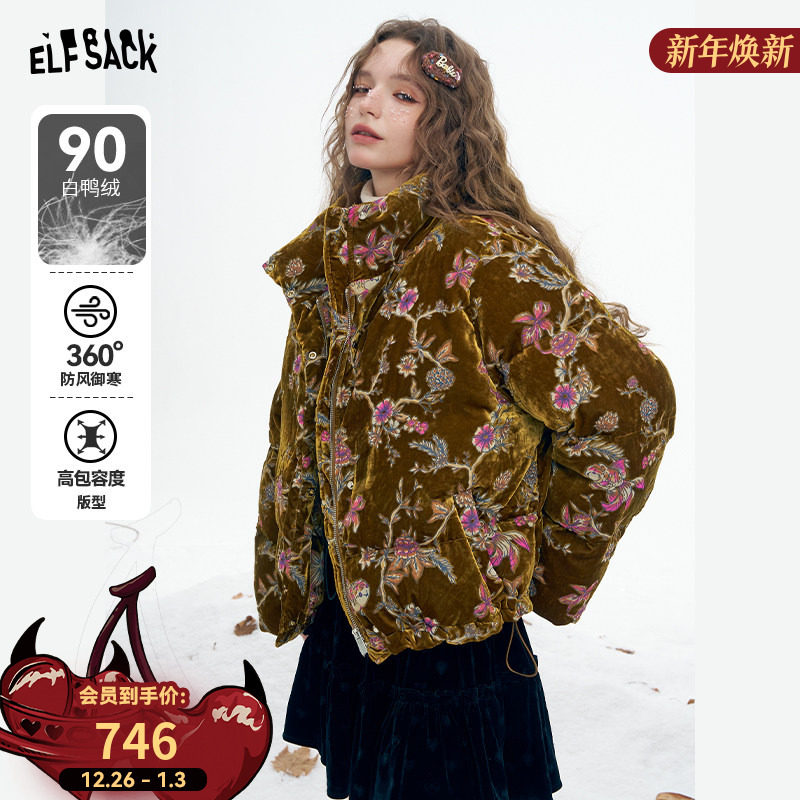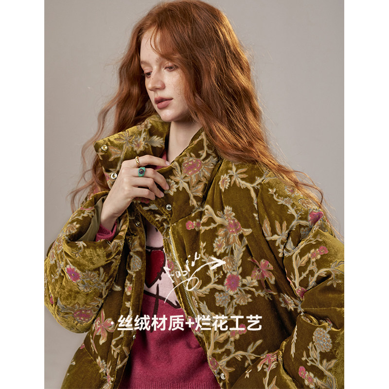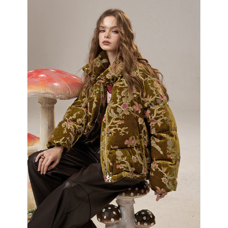 妖精的口袋复古国风丝绒短款羽绒服女2025冬季新款新中式保暖外套