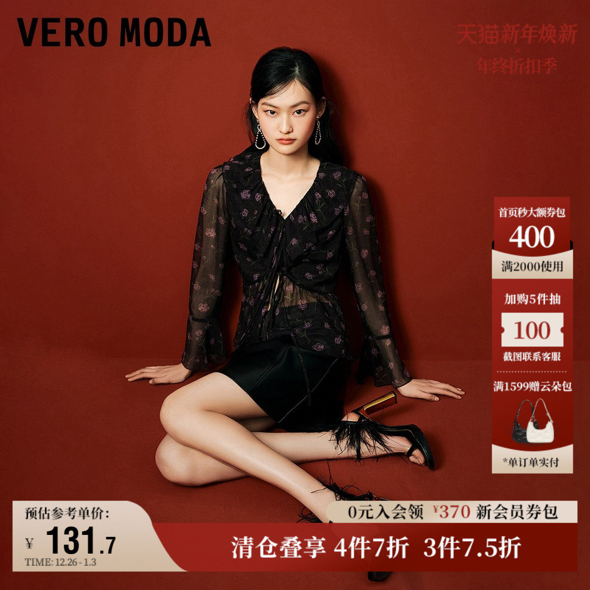 Vero Moda奥莱上衣女秋季新款玫瑰印花碎花V领透视气质雪纺衬衫