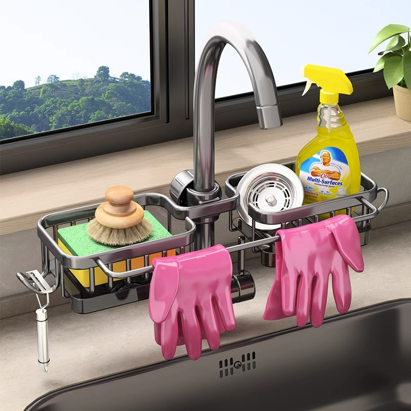 厨房水龙头置物架家用水槽用品洗碗多功能抹布沥水篮收纳架太空铝