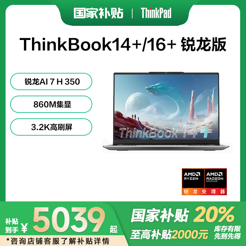 【国家补贴20%】联想ThinkBook14+/16+ 锐龙R7性能处理器 14英寸超轻薄商务办公学生游戏笔记本电脑官方