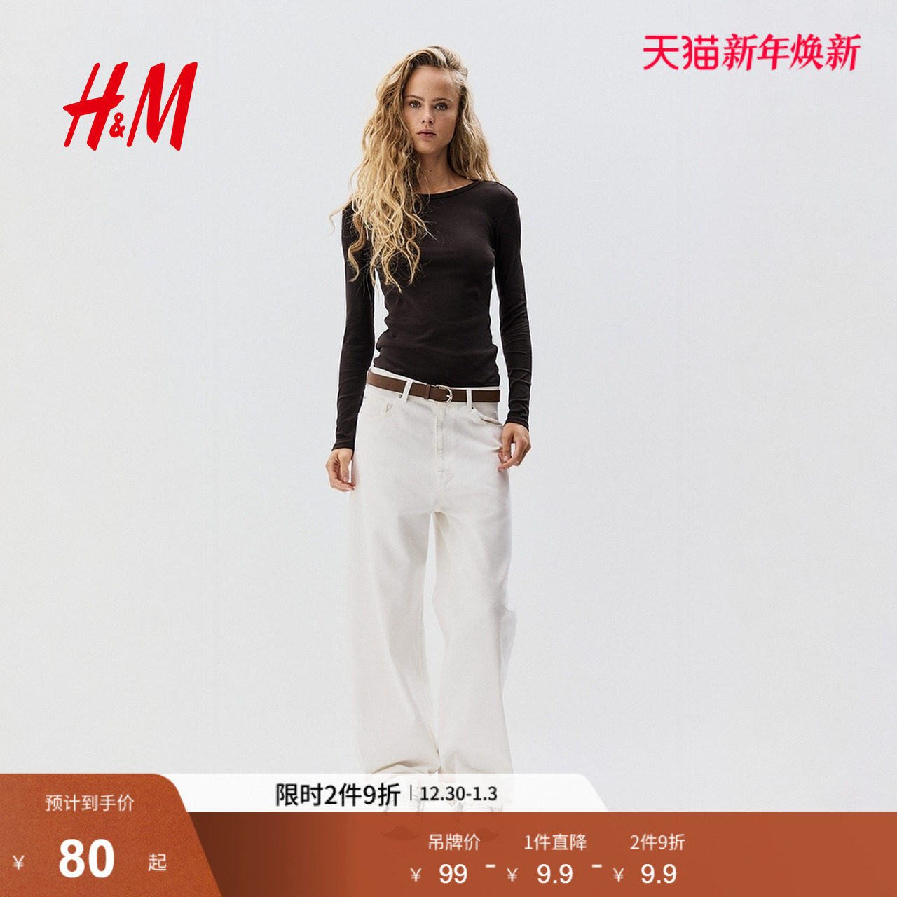 HM女装T恤冬季修身圆领棉质打底衫内搭长袖上衣1260555