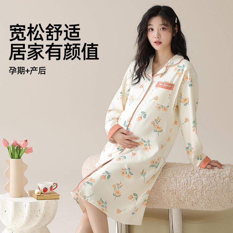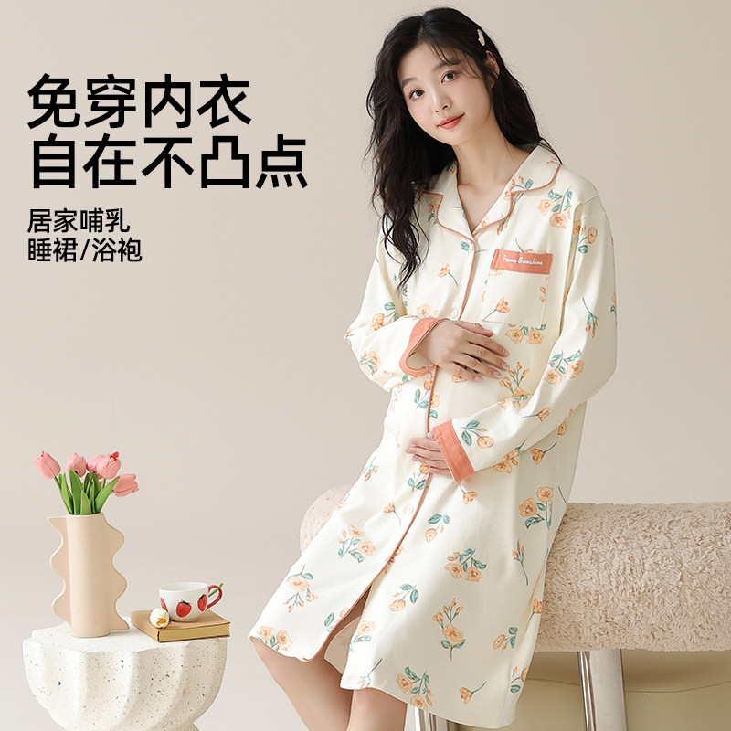 婧麒带胸垫哺乳睡裙纯棉秋冬孕妇产后喂奶月子服待产裙产妇生产裙
