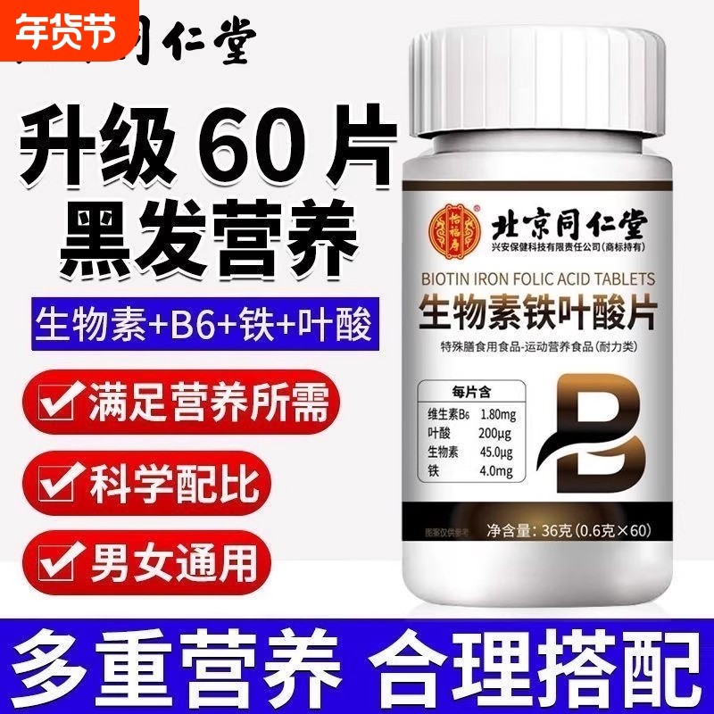 北京同仁堂维生素h片治黑发片白头发根转黑维生素正品体质功效
