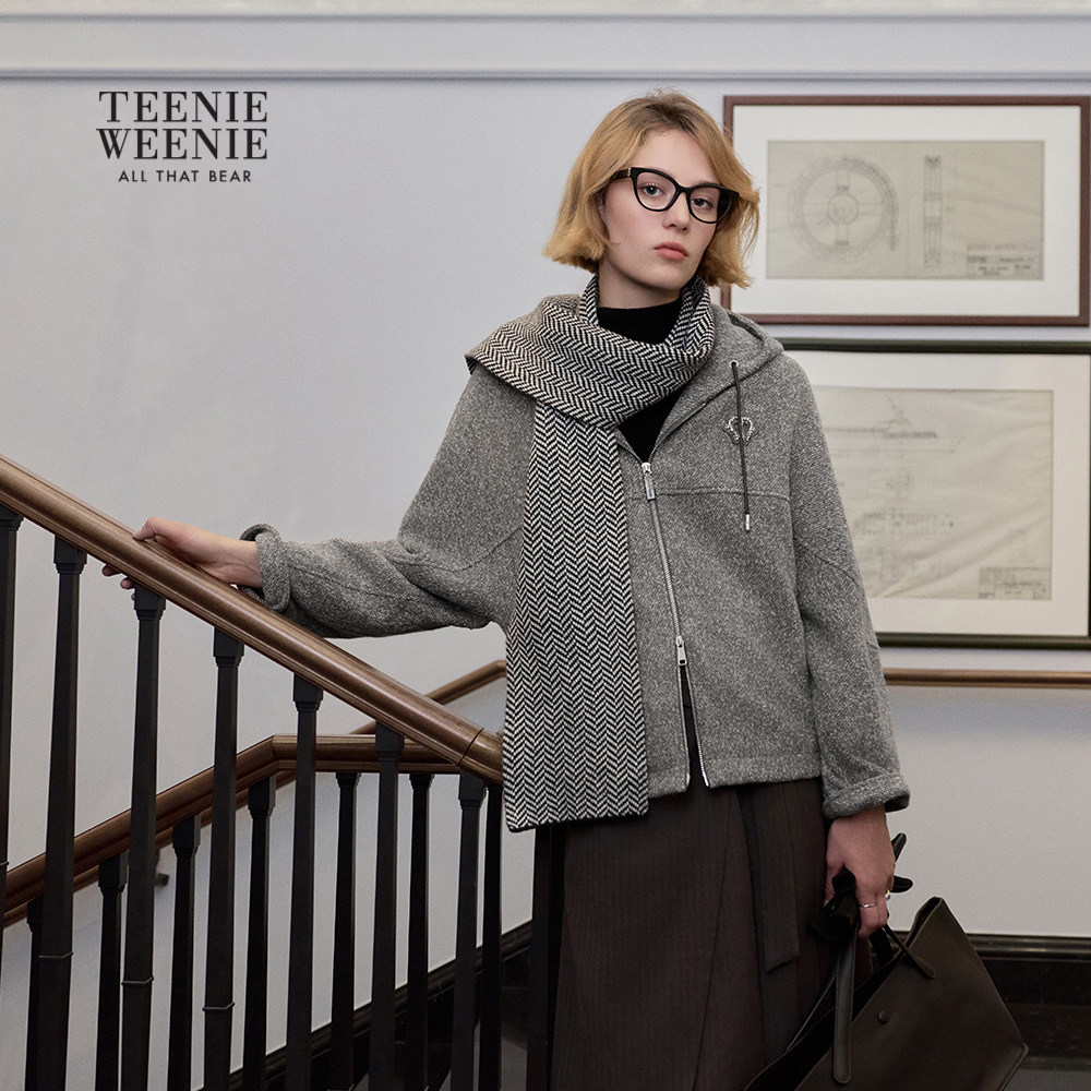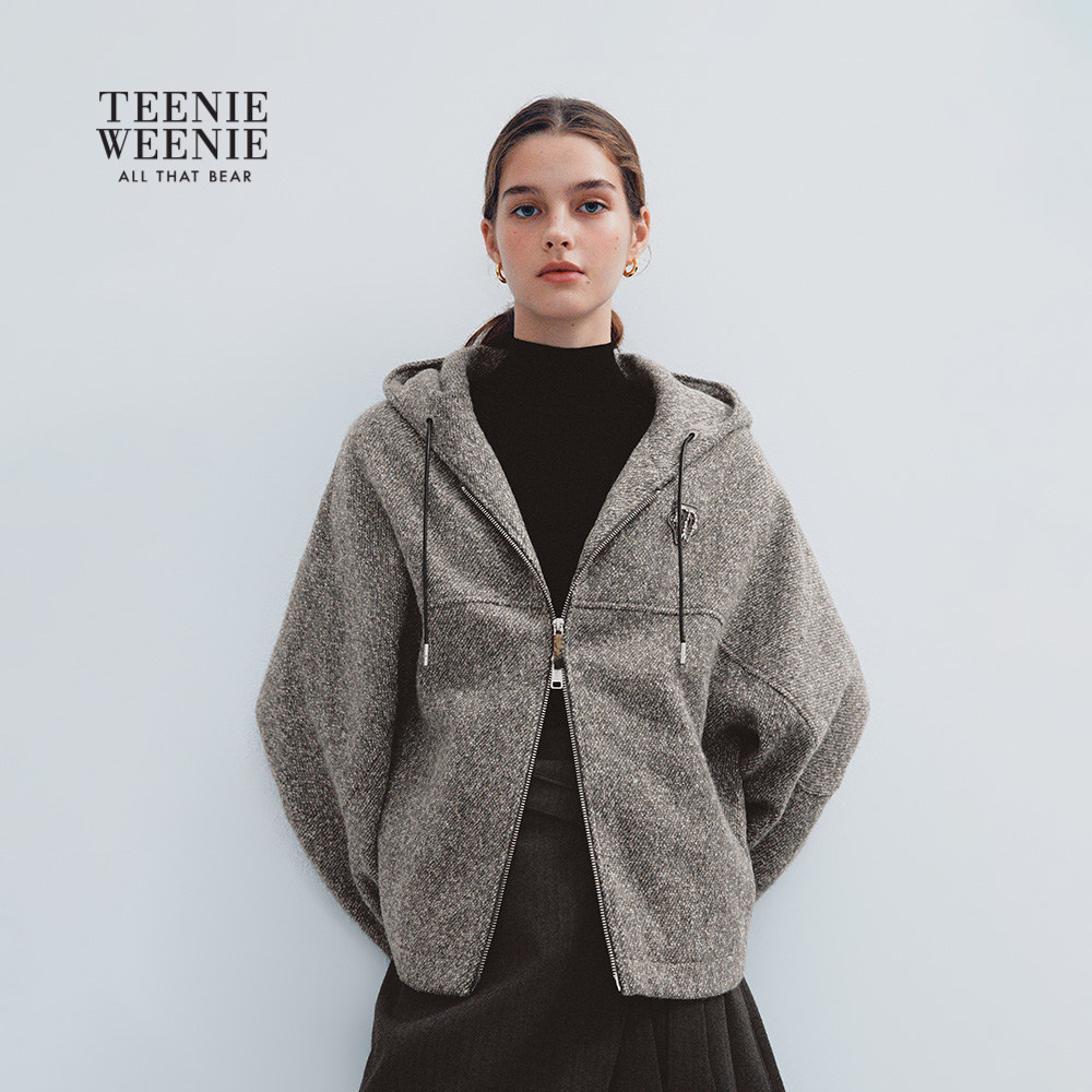 TeenieWeenie小熊女装毛呢外套2025冬季新款简约时尚休闲连帽大衣