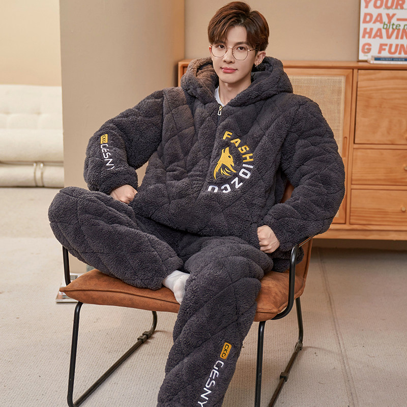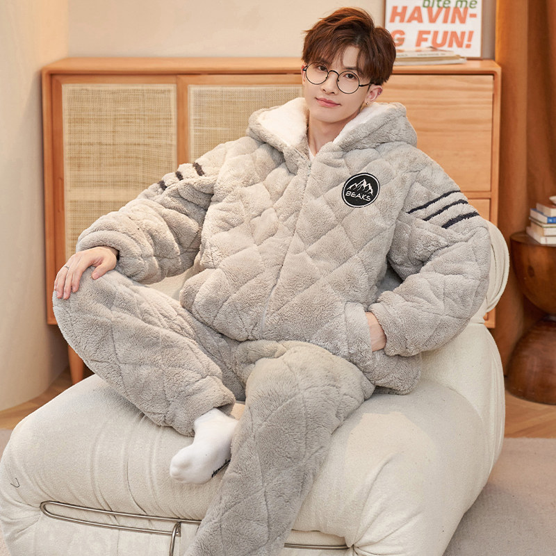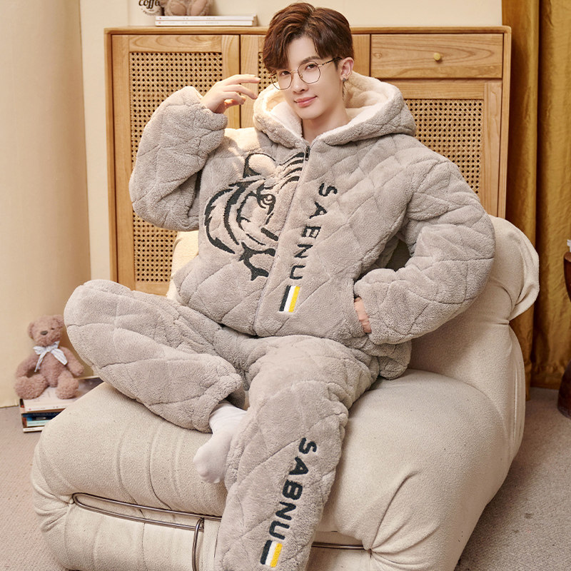 睡衣夹棉男士冬季珊瑚加厚加绒保暖三层可外穿法兰绒家居服套装男