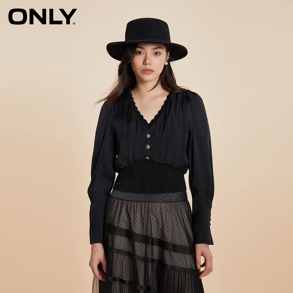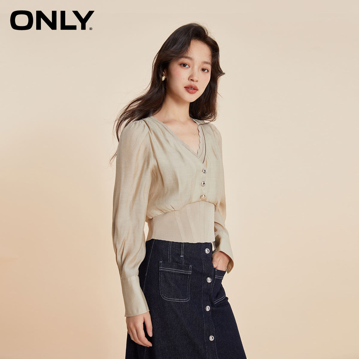 【ONLY奥莱】春季新款气质质感V领泡泡袖假两件雪纺衫女