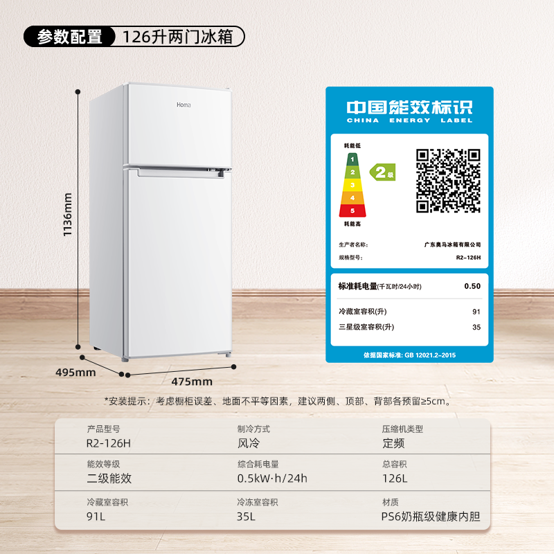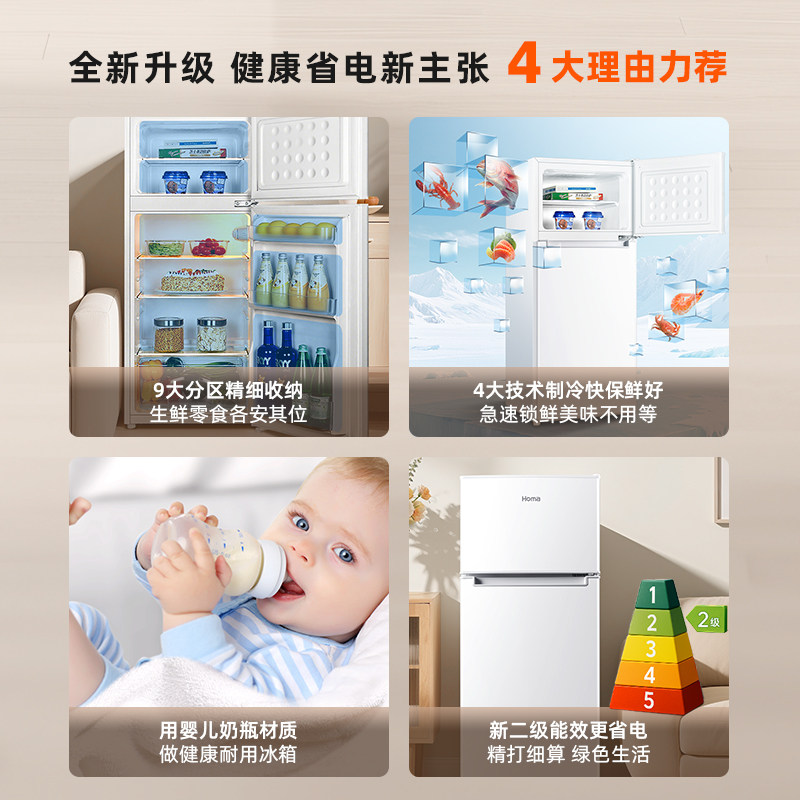 奥马小冰箱家用小型125L出租房用宿舍二人用冷藏冷冻两用节能冰箱