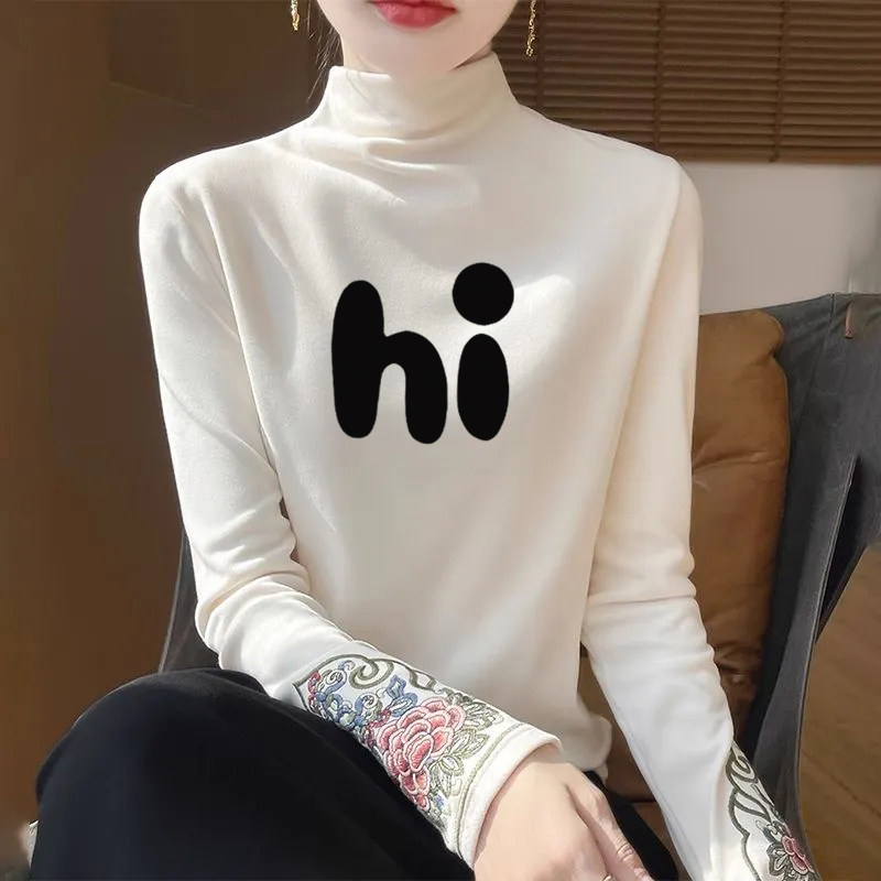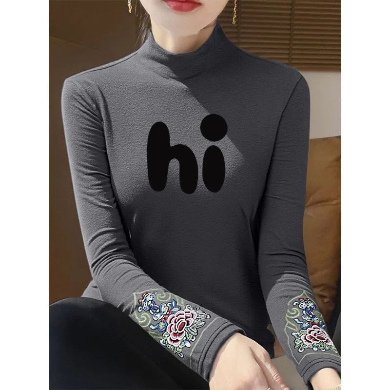 秋冬半高领德绒打底衫女复古民族风长袖中式T恤国风印花保暖上衣