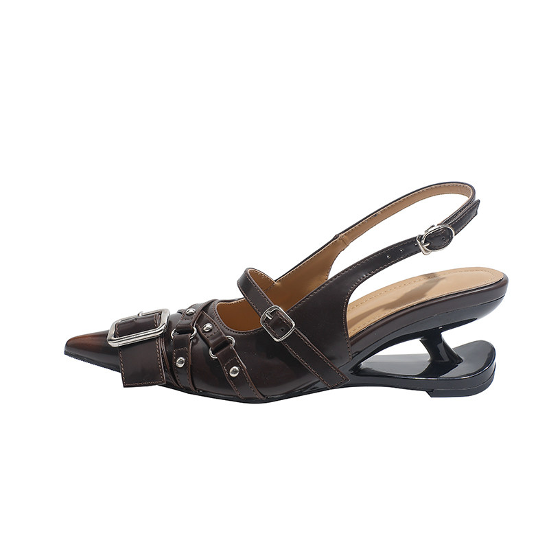 真皮~骄屿设计感尖头浅口单鞋擦色皮带扣包头凉鞋小众坡跟高跟鞋