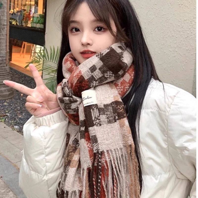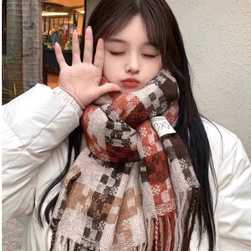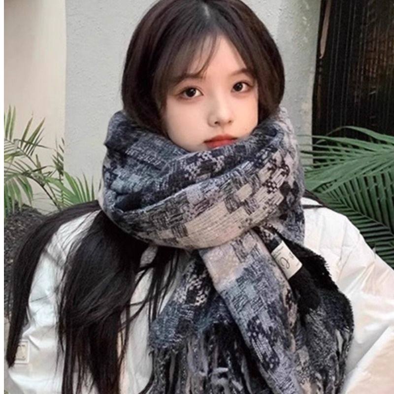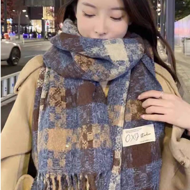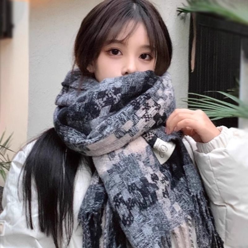 2025新款秋冬氛围感流苏保暖围巾女情侣加厚围脖灰色韩系格纹蓝色