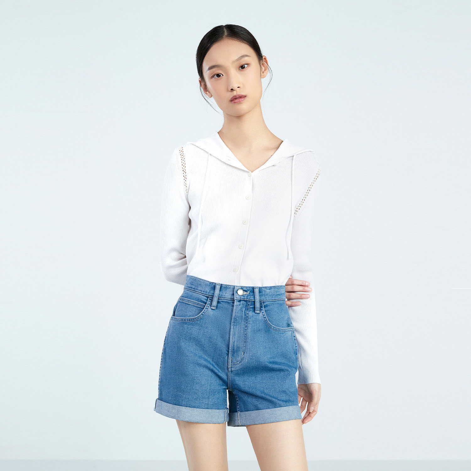 OVV春夏热卖女装棉质醋酸清爽休闲抽绳连帽长袖针织开衫外套