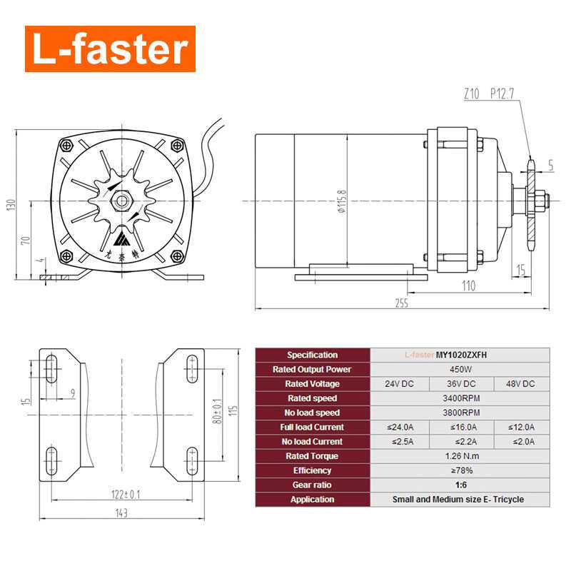 450W电动有刷电机高扭矩单元电机MY1020ZXFH带行星齿轮三轮车