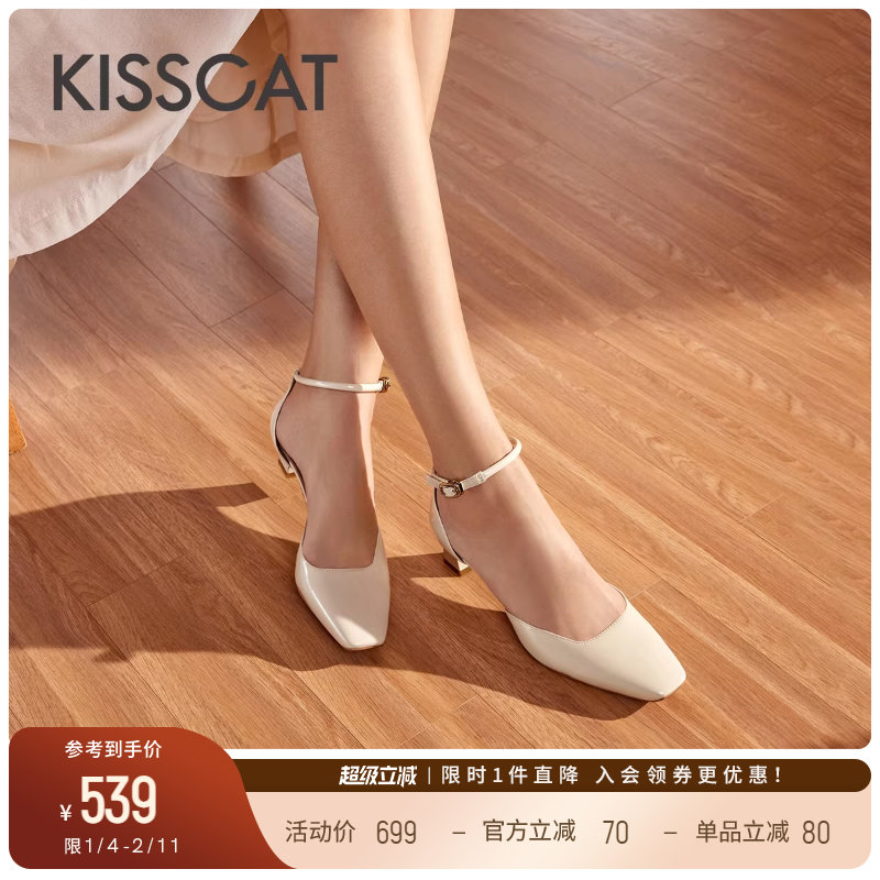 KISSCAT接吻猫新款小方包粗跟单鞋玛丽珍鞋法式复古通勤单鞋女