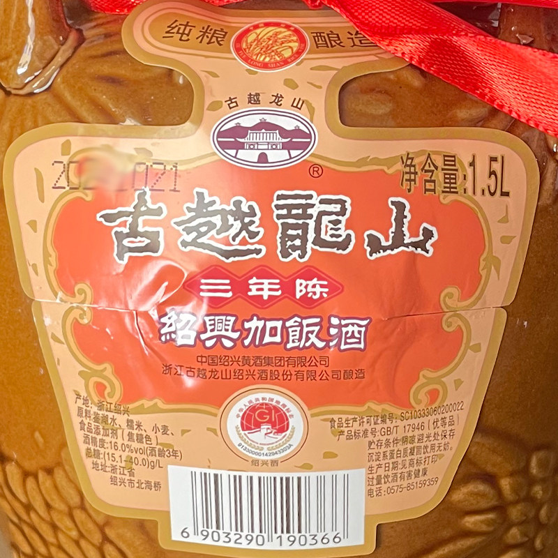 绍兴黄酒古越龙山16度三年陈加饭酒花雕糯米酒1.5L坛装十年酿酒