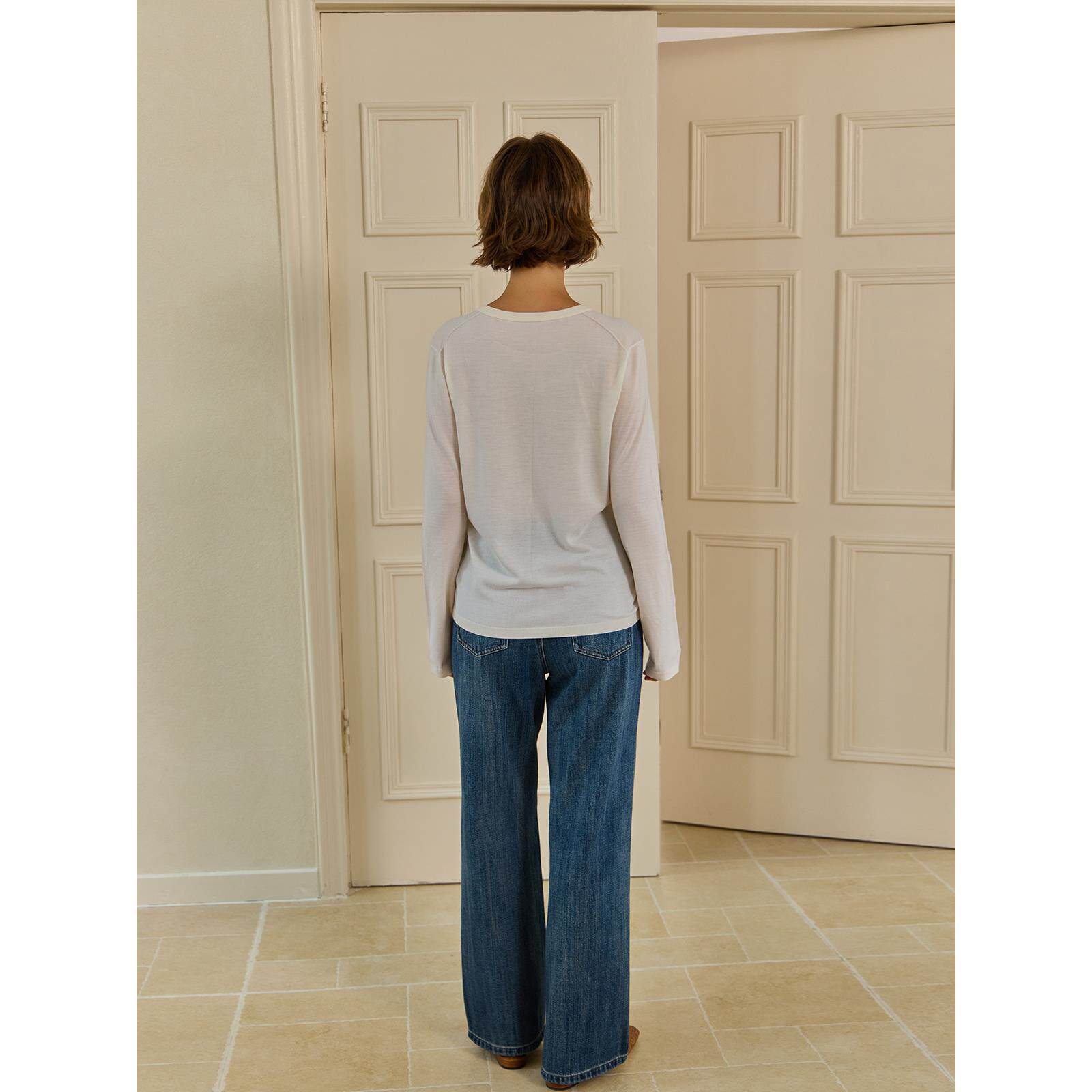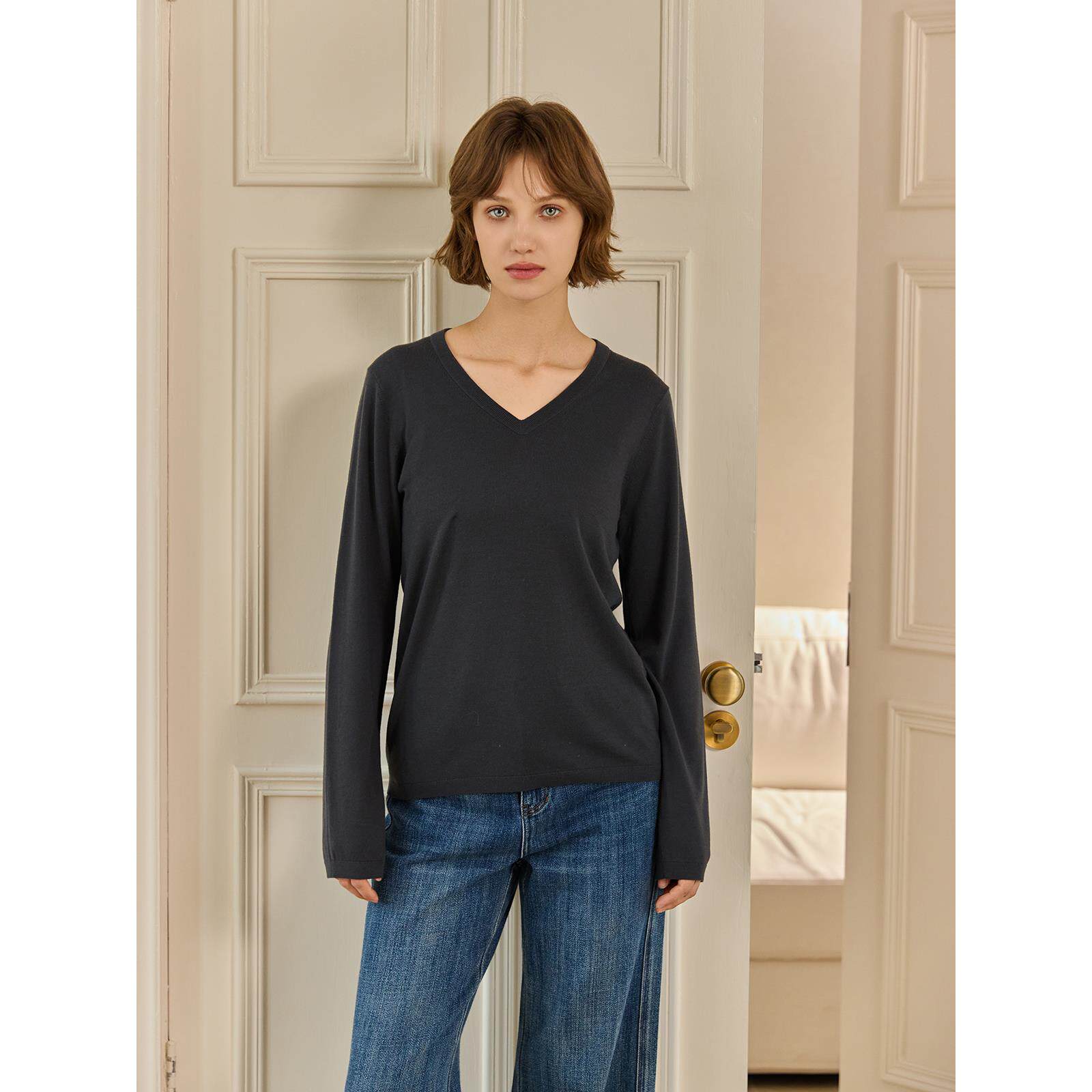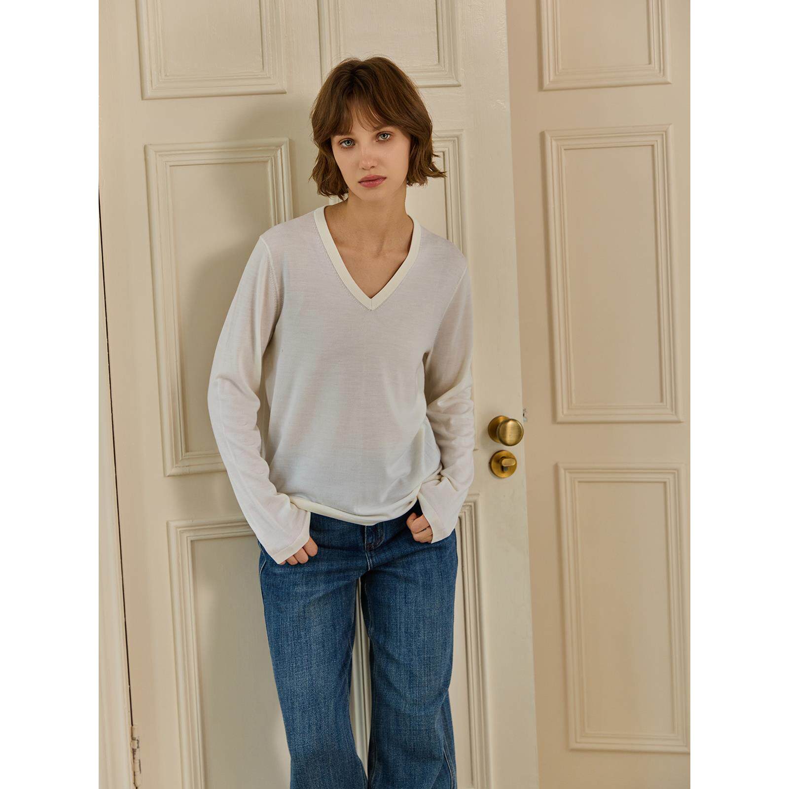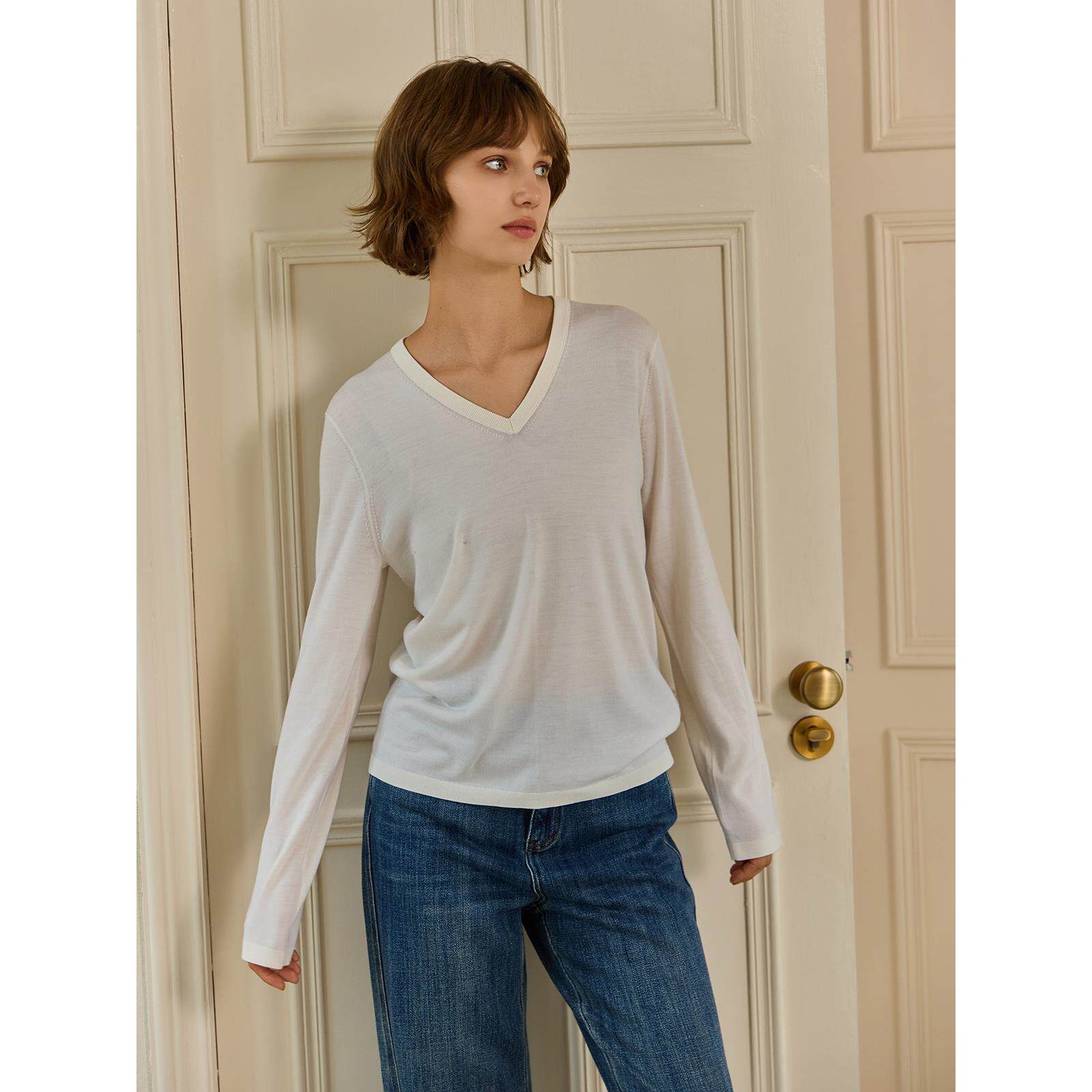 THEEASE舒适派超细精纺巴素兰羊毛打底衫休闲百搭V领质感针织毛衣