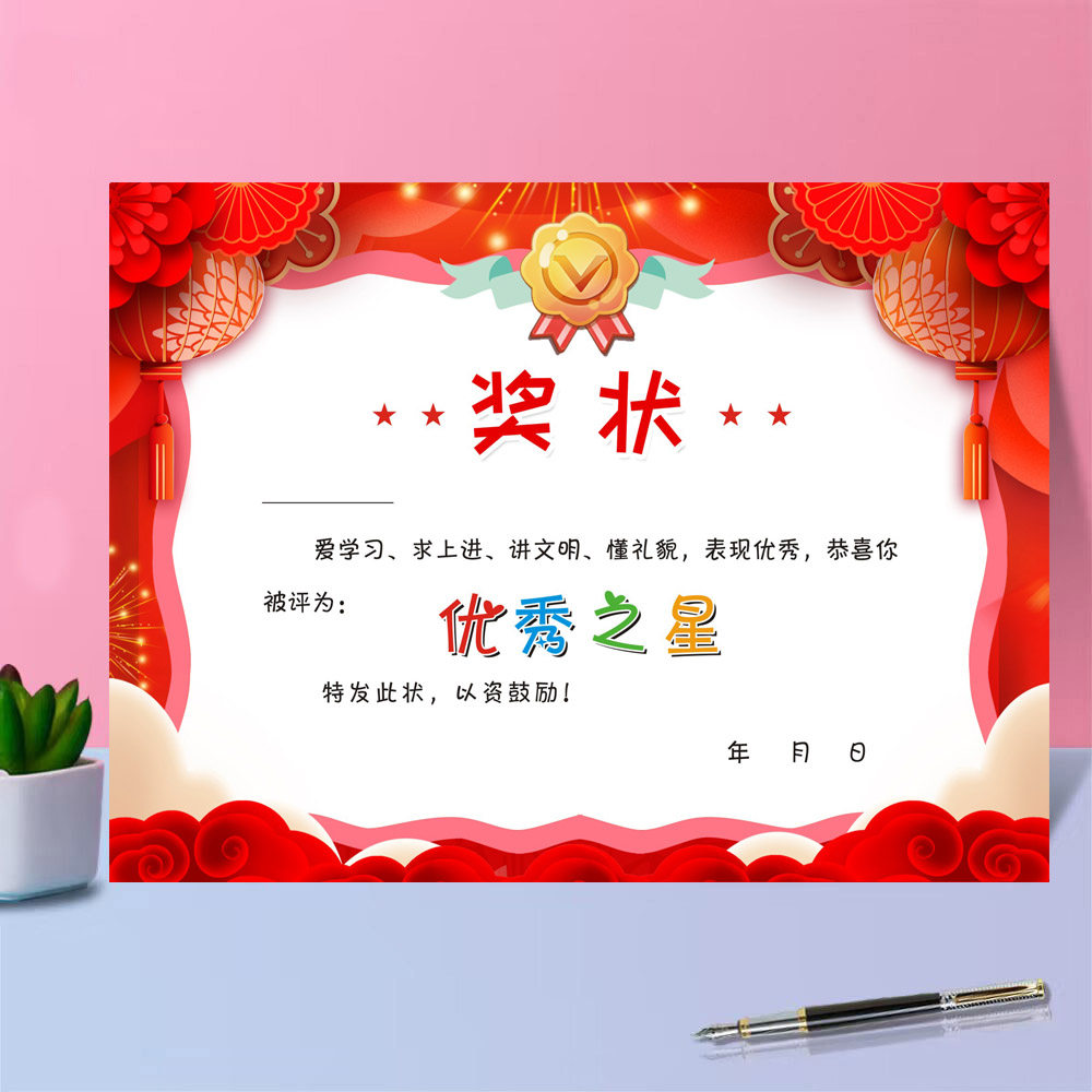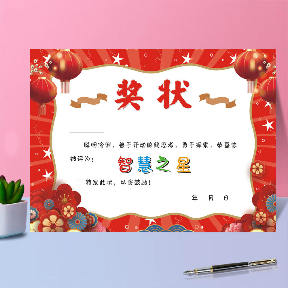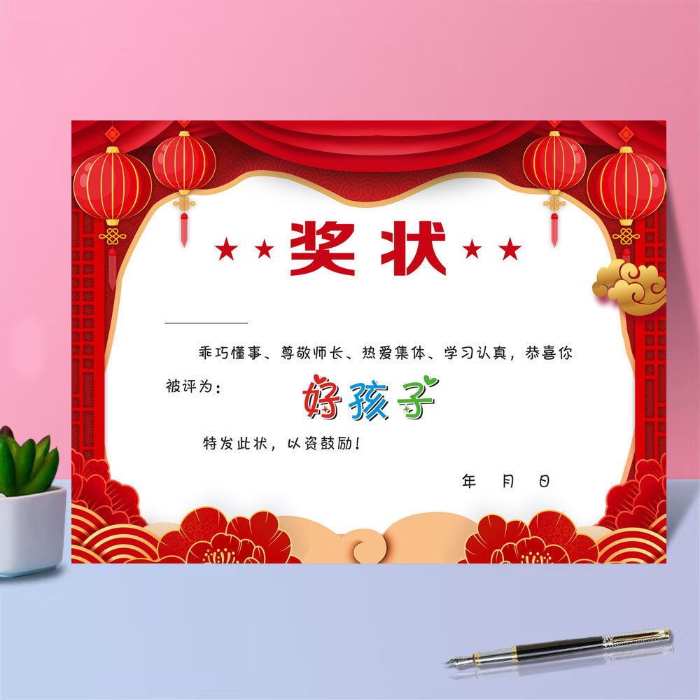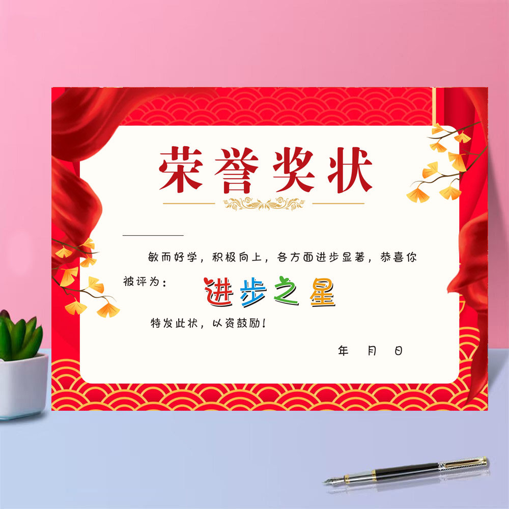 新年红色喜庆奖状200g铜版纸a4赠送学员好孩子优秀进步智慧学员奖