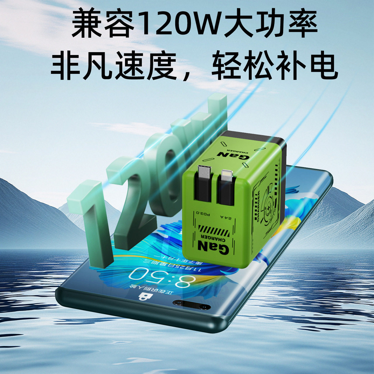 【国标3c认证】兼容120WGaN氮化镓充电器全协议闪充充电头欧美英规自带双伸缩线Typec适用苹果超级快充充电头