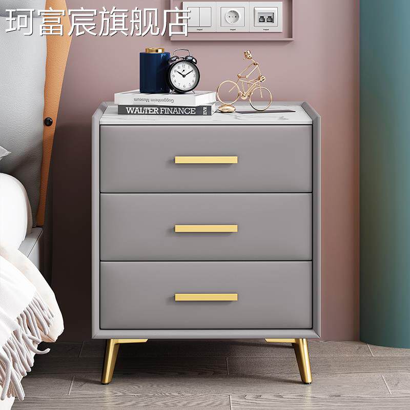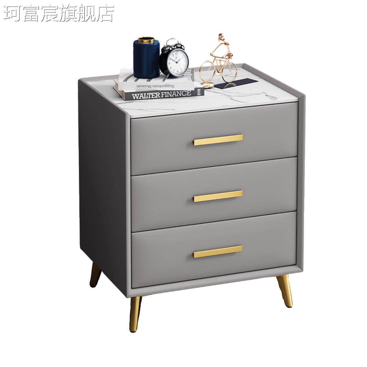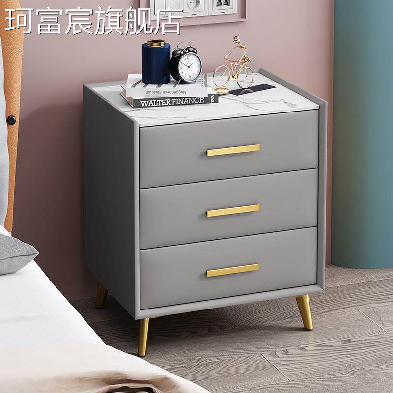 珂富宸岩板三抽床头柜皮艺轻奢卧室储物收纳柜岩板简约现代加高三层柜子摆件饰品床笠拉车盖布