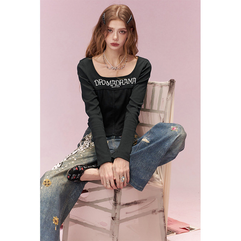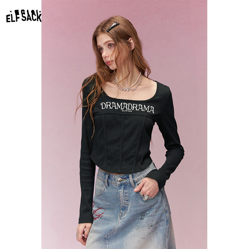 妖精的口袋白色U领字母修身长袖t恤女2026年早春新款短款内搭上衣