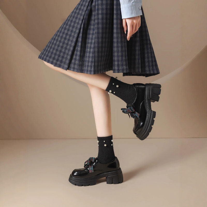 黑色小皮鞋女2025年新款春秋蝴蝶结深口单鞋女鞋子粗跟厚底乐福鞋