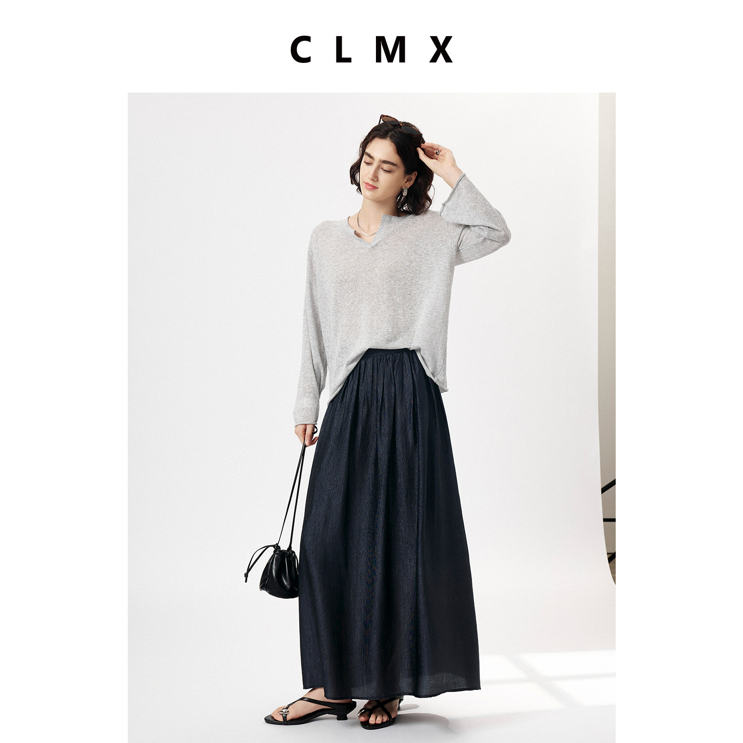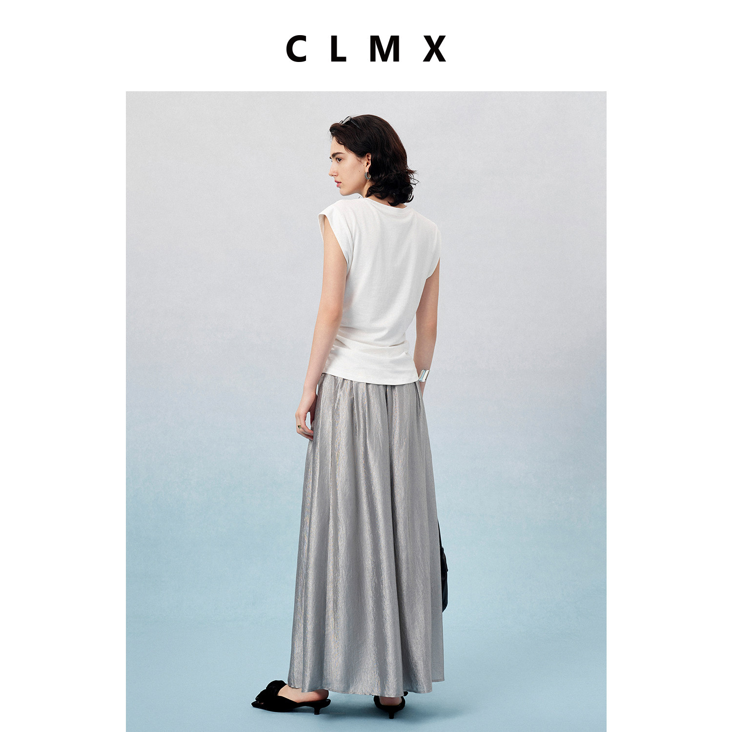 CLMX夏季简约通勤长裙雾光细坑条肌理混纺醋酸面料褶皱半身裙