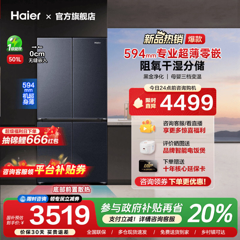 [换新补贴]海尔501L超薄零嵌入式十字双对开四门家用一级无霜冰箱
