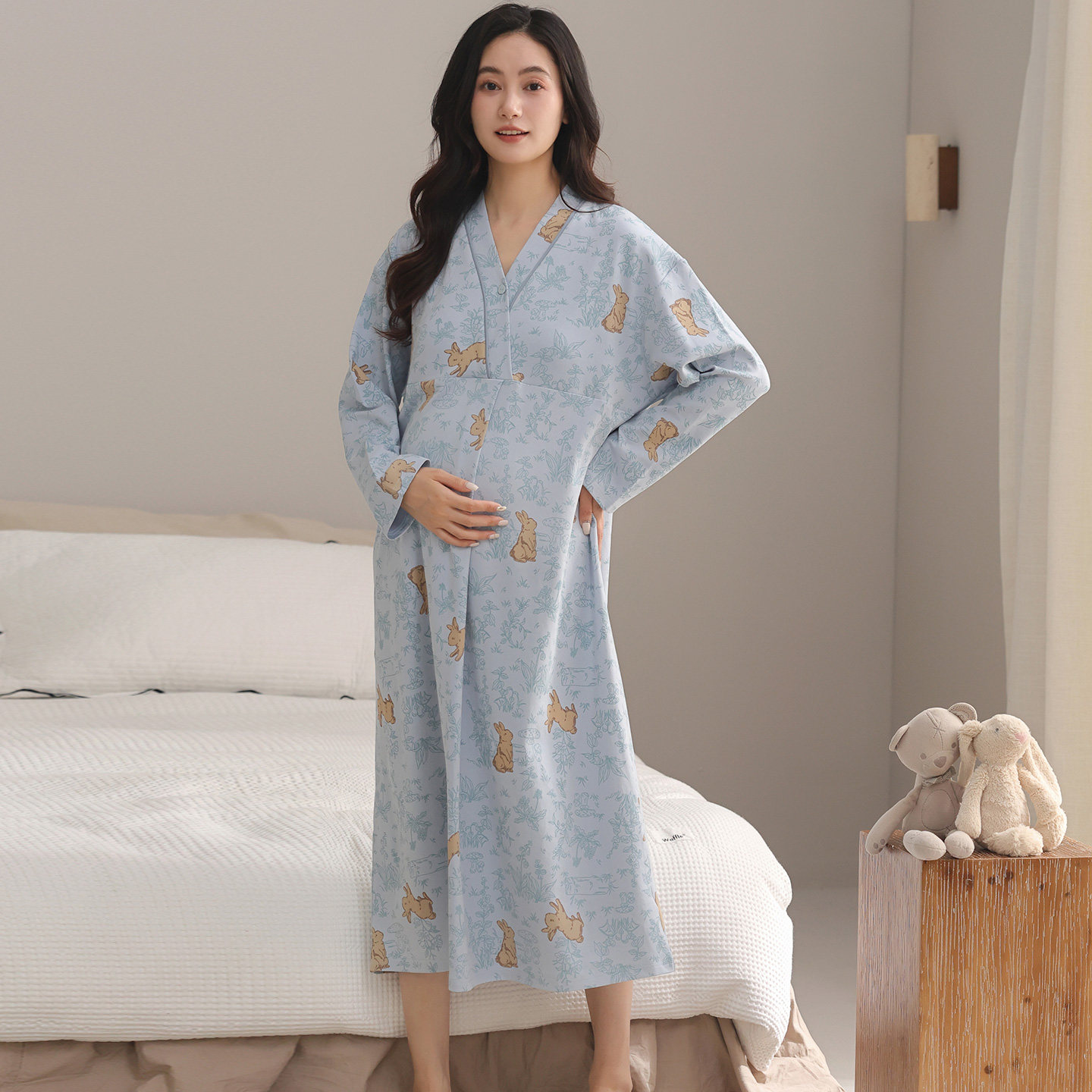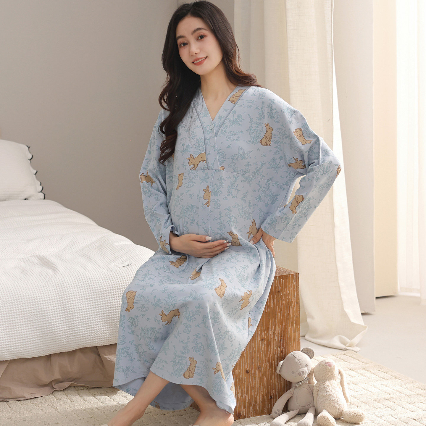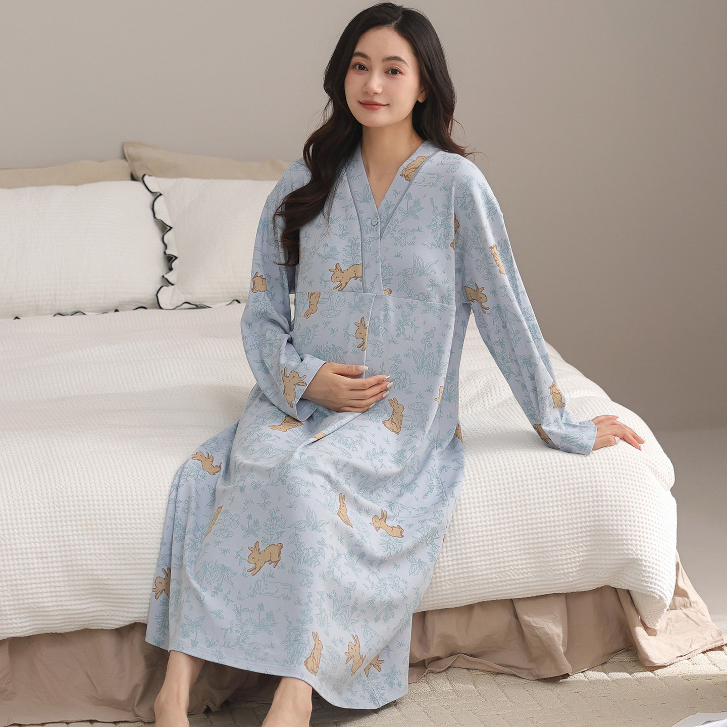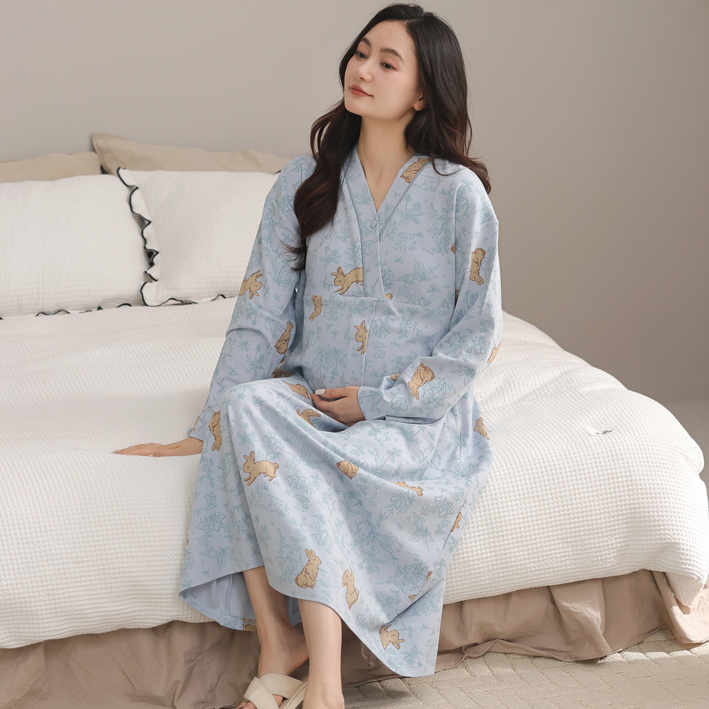 都市丽人2025年月子服带胸垫哺乳睡裙女春秋纯棉产后喂奶孕妇睡衣