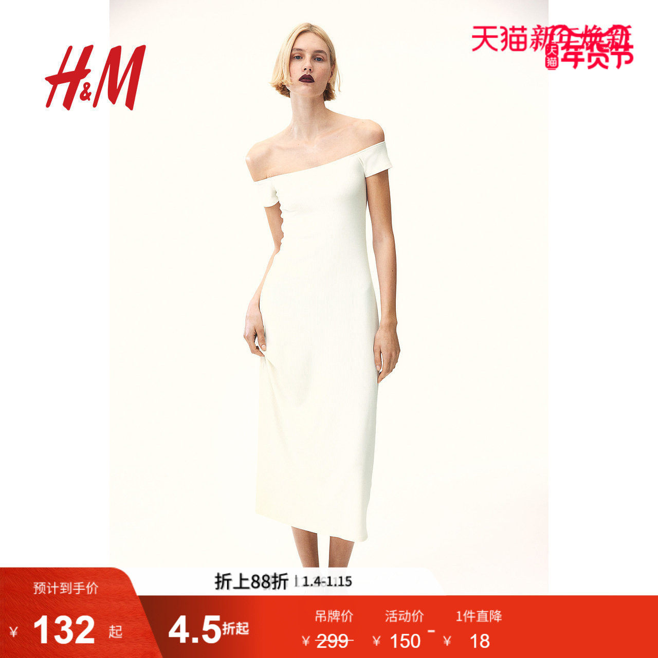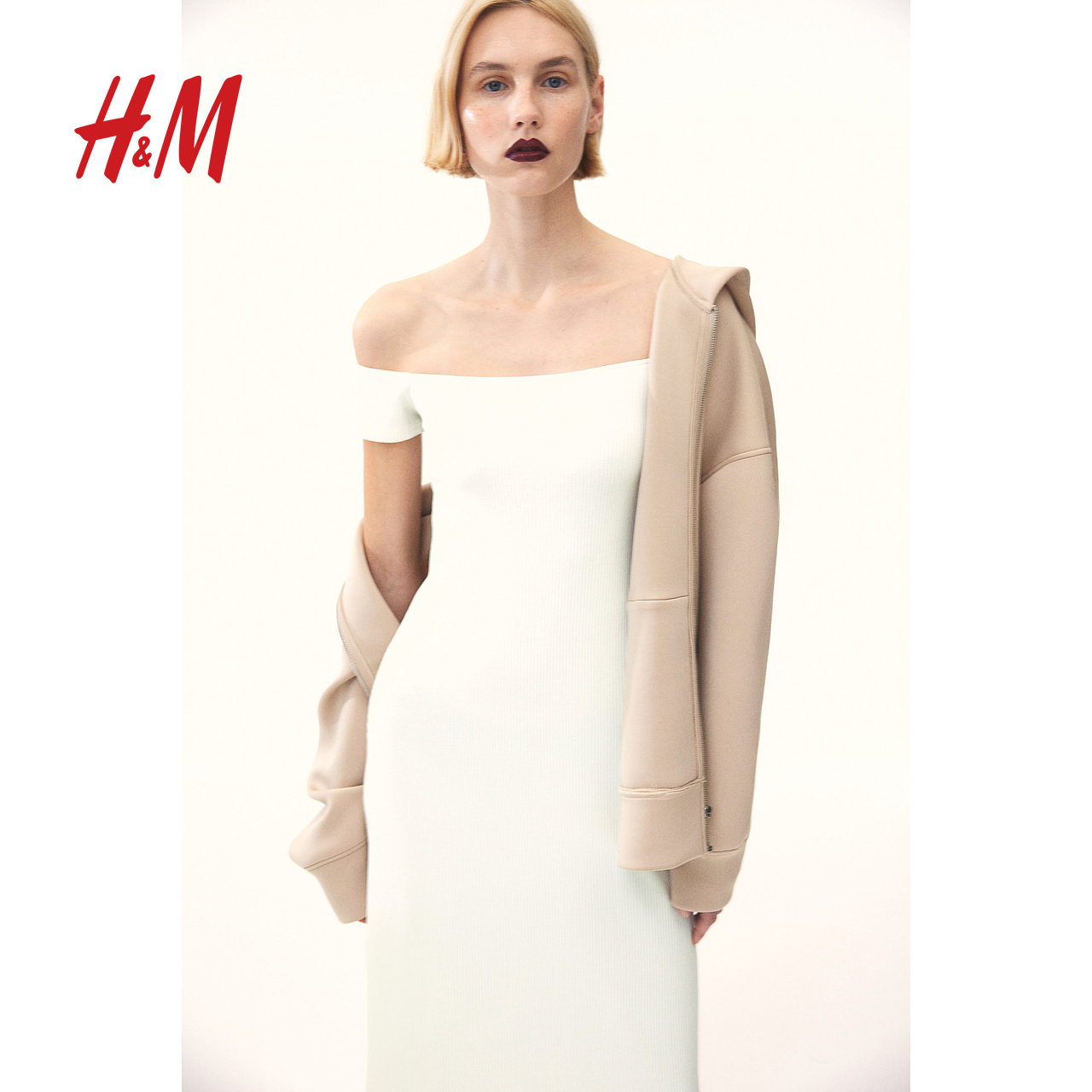 HM女装连衣裙春季短袖一字领罗纹针织修身中长裙1223835