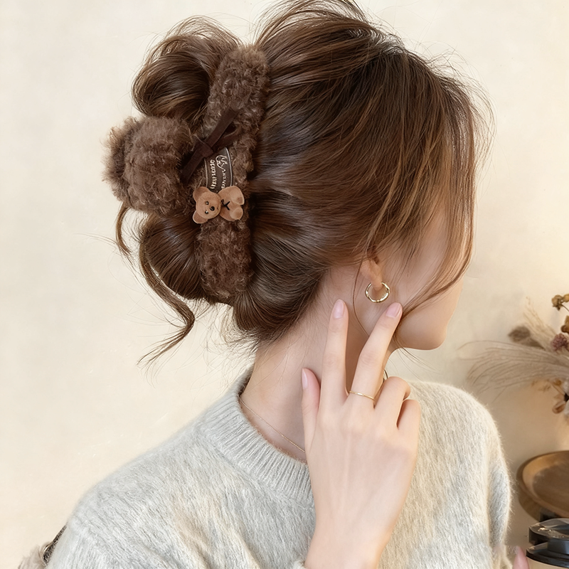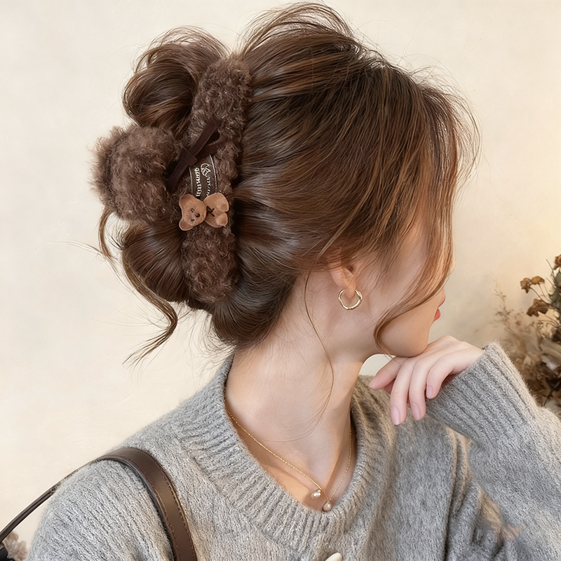 韩系毛绒小熊头发抓夹女高级感大号发量大秋冬发夹女后脑勺鲨鱼夹