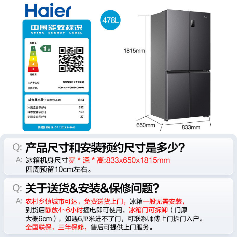 [换新补贴]海尔478L四门十字双对开门家用变频一级能效无霜电冰箱
