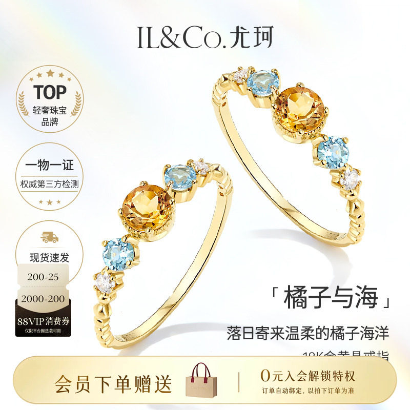 ILCO尤珂「橘子与海 」18K金天然黄水晶戒指蓝托帕石彩色宝石女戒